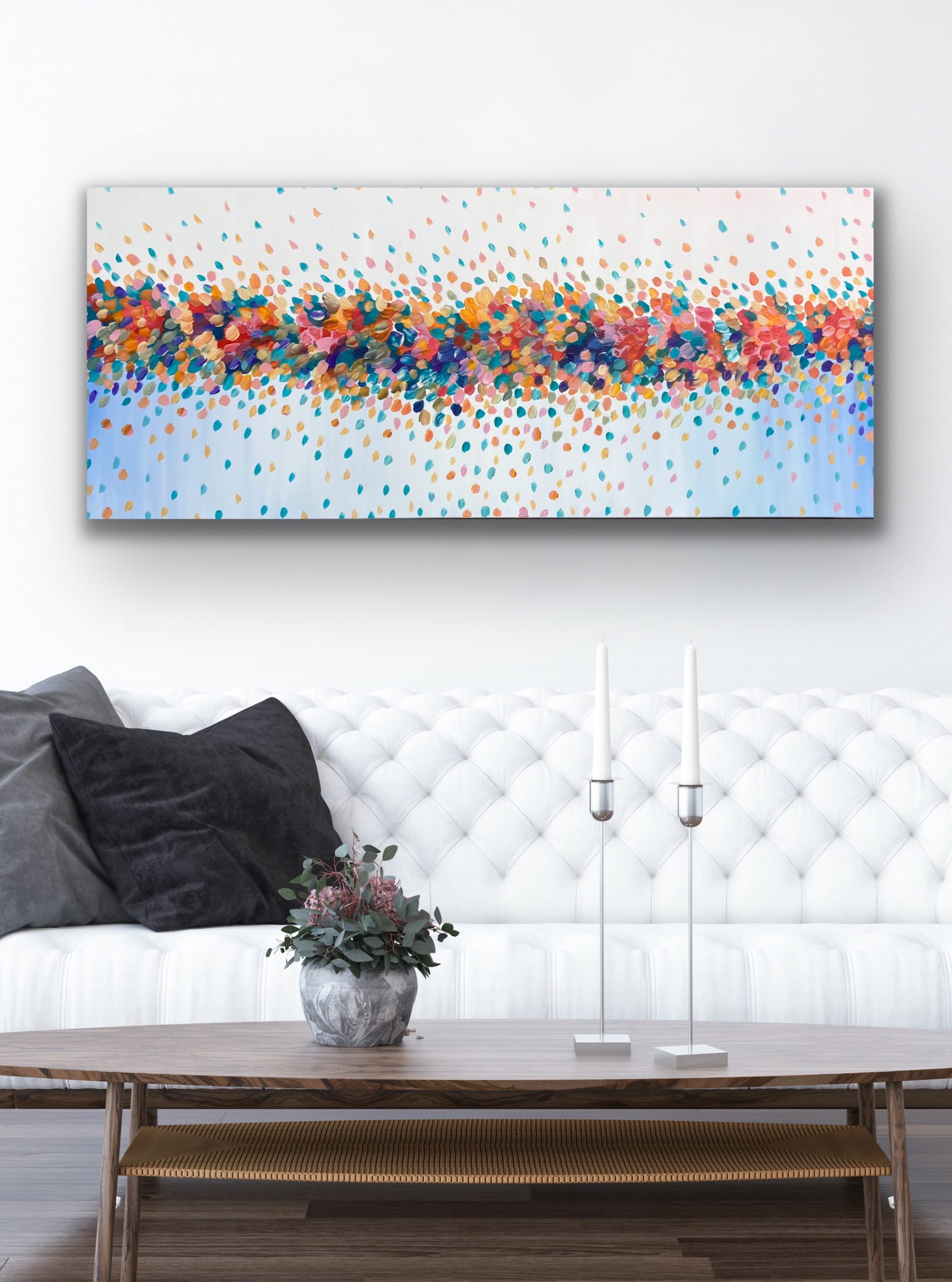 Rainbow of Petals by Theo Papathomas – A beautiful rainbow of petals in the sky falling onto the landscape creating an electric explosion of petals. A rainbow of petals in the sky like musical notes dancing to their own song. Hope with this work it makes the viewer feel very peaceful and tranquil. I tried to create so much depth in the painting with a beautiful light blue sky . The painting is signed and dated 2021 at the back and comes with a certificate of Authenticity.