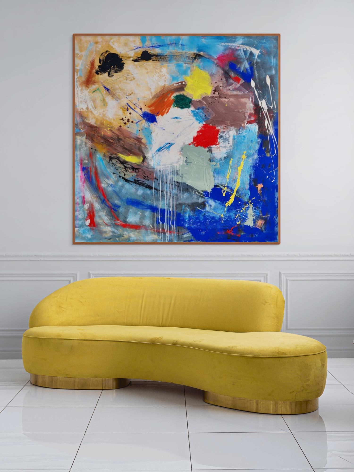This modern piece was created with acrylic paint and oil sticks. It was sprayed with varnish for a protection of colour.