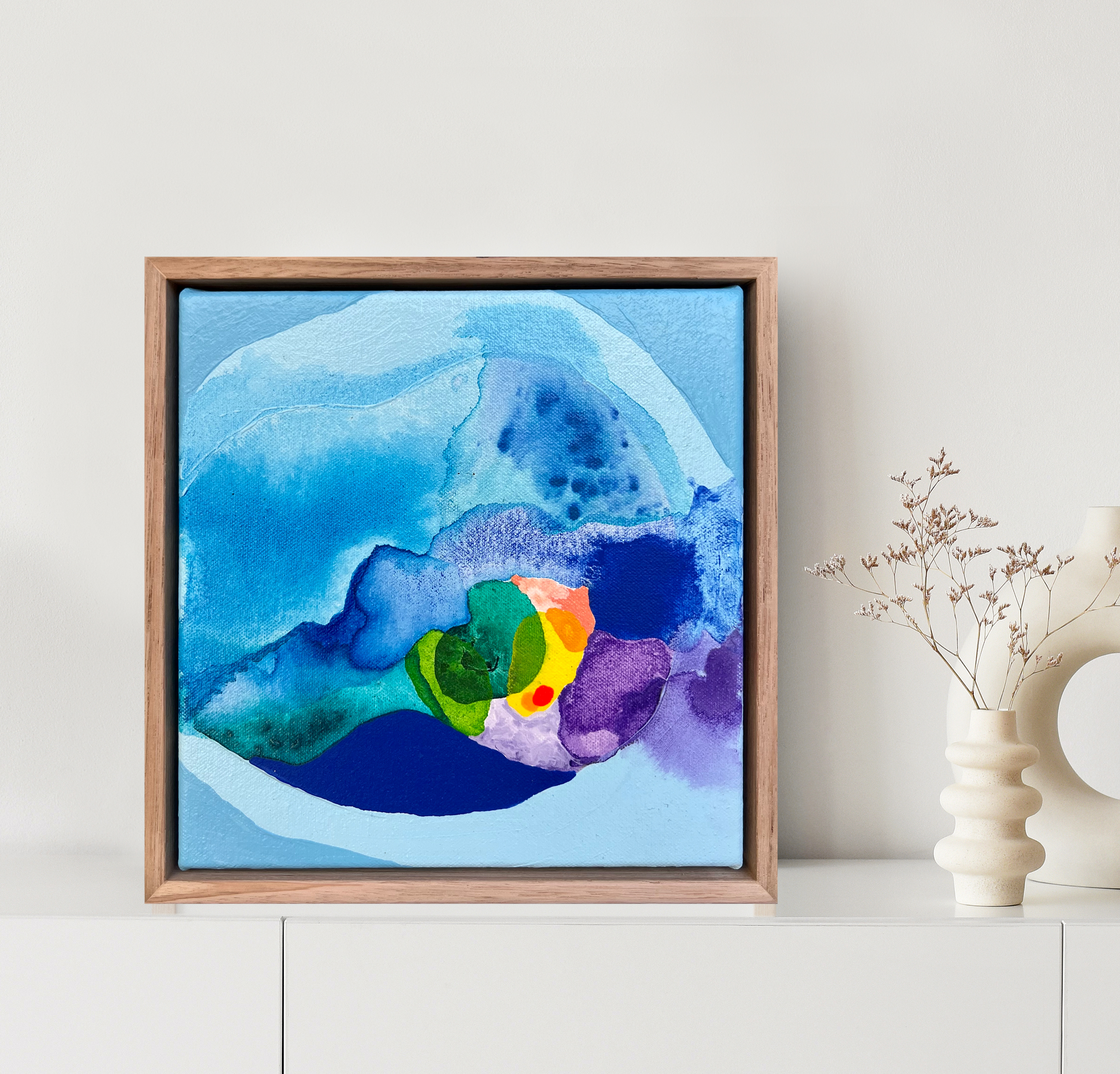 The random, unpredictable swirls of coral shapes and hues drift through my inner creative thoughts and onto canvas – they capture what little worlds and pockets of the ocean might look like. The abstract fluidity of the coral and water is depicted through the curves in the acrylic and layers of colour build the worlds that I imagine. The organic shapes of the coral envelope and caress each other, coalescing harmoniously to create a magical structure of reef.”