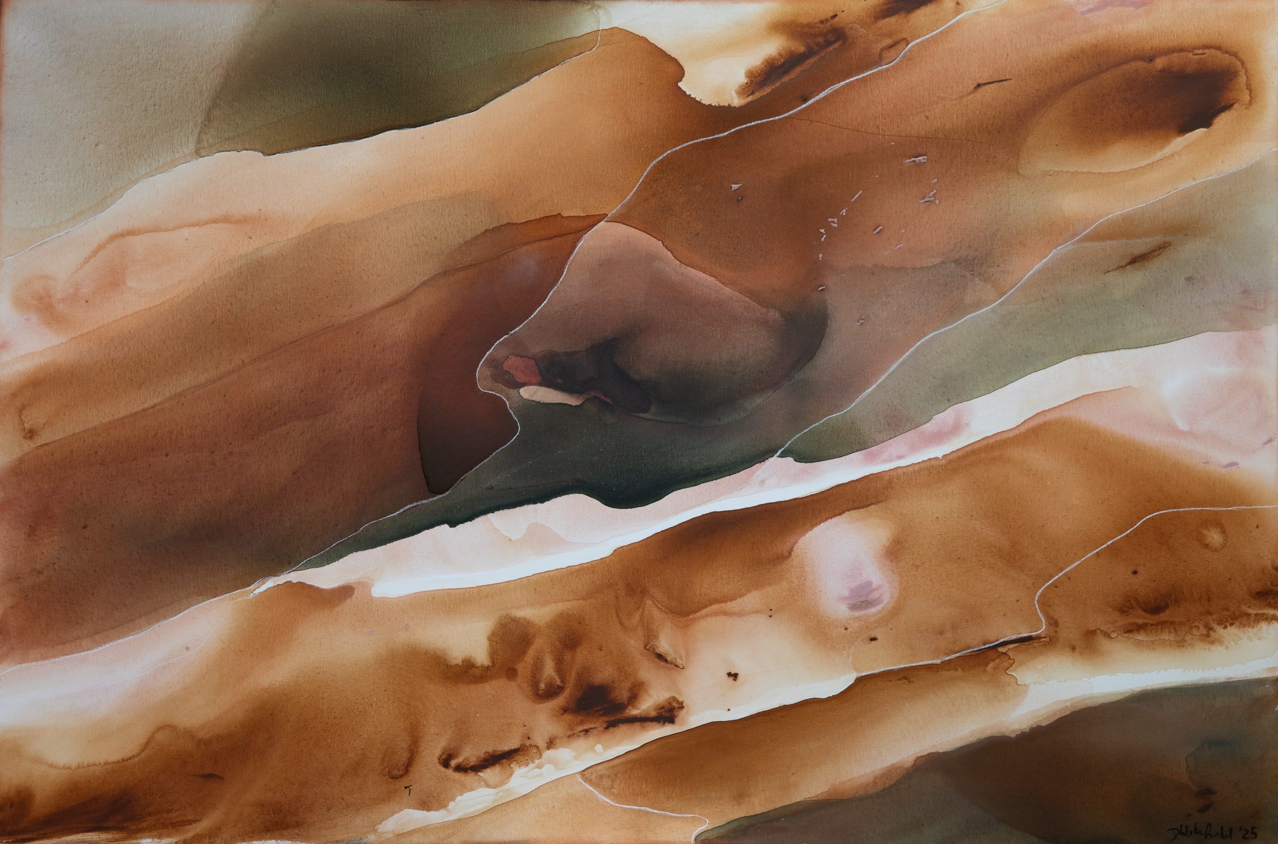 I have mixed a variety of desert colours for use in these paintings: ochres, terracotta’s, pinks, and browns, plus a selection of oxide, to create the effect of moving through this unique landscape.