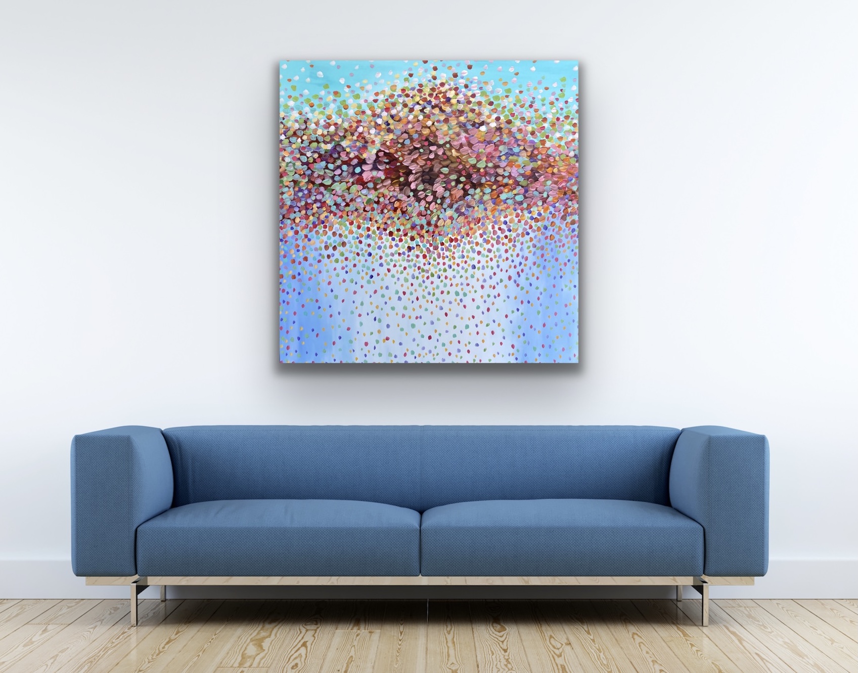 Rainbow Symphony by Theo Papathomas is a very soothing and tranquil painting where a beautiful rainbow of petals dancing over the sky. Capturing the beautiful colours of the petals falling from the sky onto the sea. A rainbow of petals creates this beautiful bouquet of colours like butterflies in the sky. I tried to create so much depth and space in the painting. An explosion of colours like fireworks over the sky , creating a symphony of musical notes. The painting is signed and dated 2021 at the back and comes with a certificate of Authenticity.