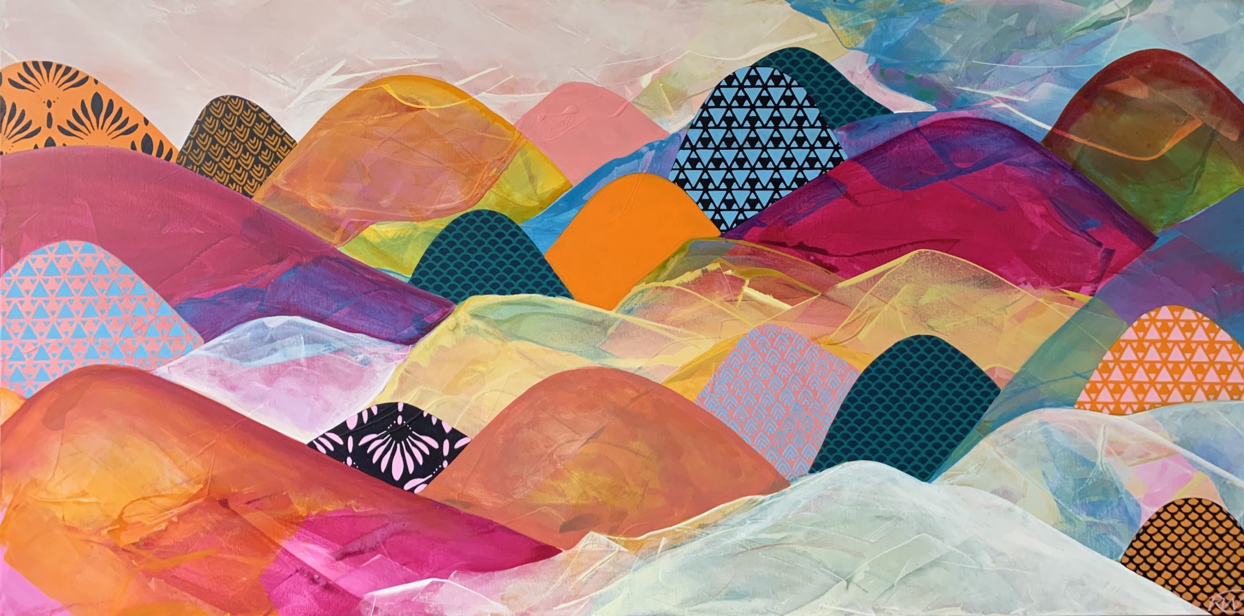 Rainbows End by Rebecca Warr – This large scale canvas represents my interest in shape, pattern and the use of vibrant hues in the production of artwork. The base layer has been built up with the use of a catalyst wedge followed by more deliberate brush work to define the mountain like shapes. Opaque layers of paint have been applied over some of the shapes to increase interest and draw the viewers eye. Finally, stencilling has been added, further enhancing aesthetic appeal in the work. I have titled this artwork ‘Rainbows End’ because it represents to me a vision of a mountainous scene at the end of a rainbow.