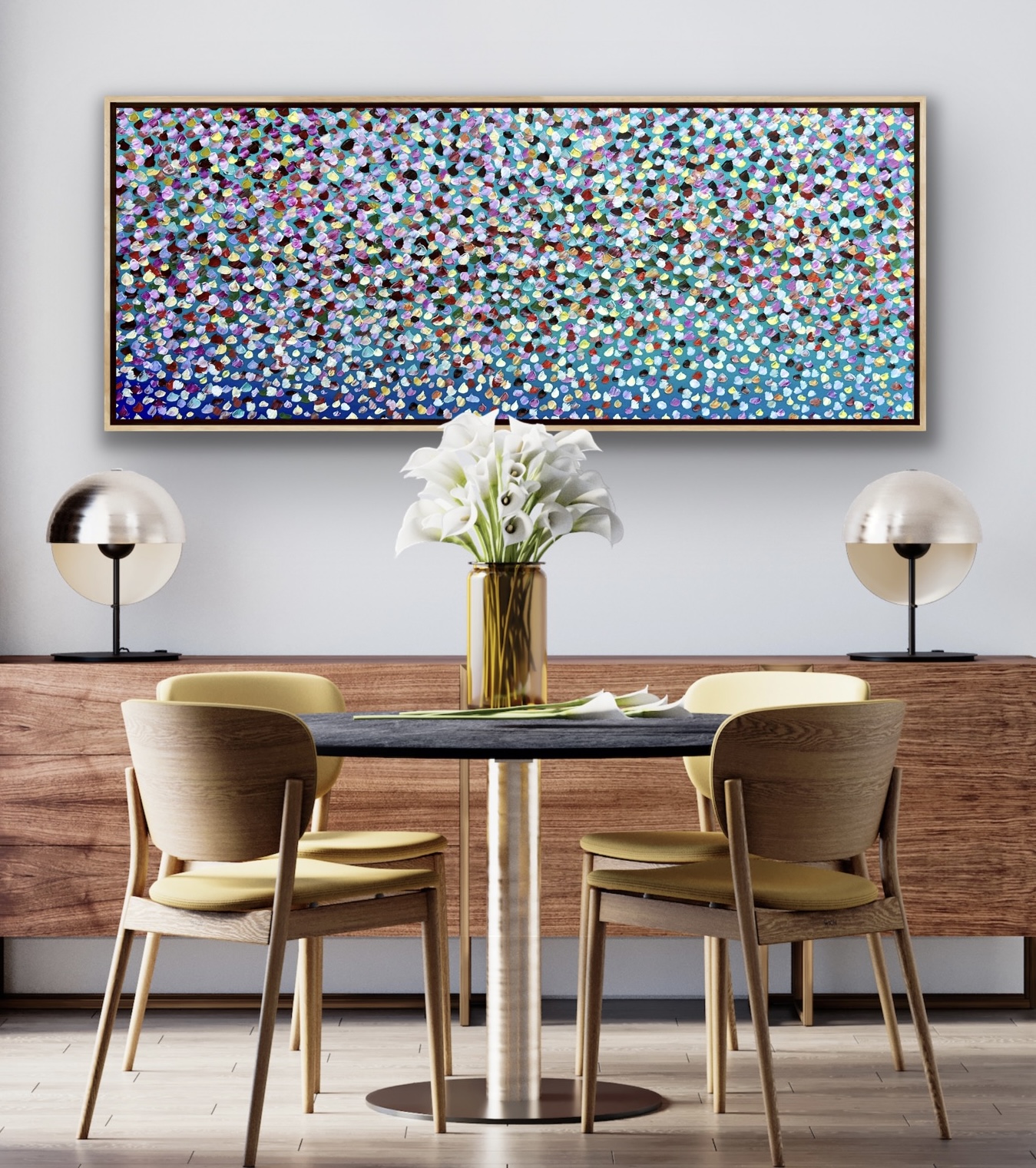 Reach for the Stars by Theo Papathoms is a painting with rainbow colour petals in the sky falling onto the landscape creating an electric explosion of petals. Fireworks of petals in the sky like musical notes dancing to their own song against the beautiful sky. Hope with this work it makes the viewer feel very peaceful and tranquil. I tried to create so much depth in the painting and filling the Sky with petals like shooting stars . The painting is painted with a pallet knife and brush in thick acrylic creating so much texture. The painting does not come with an external frame.The painting is signed and dated 2023 at the back and comes with a certificate of Authenticity.