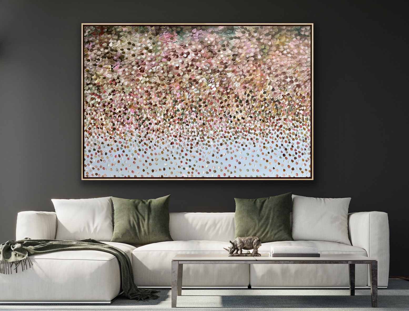 Reach for Your Dreams by Theo Papathomas – a painting with beautiful soft colours of the petals flying in the wind creating fireworks in the sky. Like beautiful jewels shining like stars in the sky. Capturing the light of the sun falling on to the petals creating a beautiful bouquet of pastel petals. Petals weeping onto the landscape creating this beautiful veil of colours covering the whole sky . A composition of colours and rhythms of petals dancing in the sky like musical notes . A very peaceful and tranquil painting with so much depth . The painting does not come with an external frame.The painting is signed and dated 2023 at the back and comes with a certificate of Authenticity.