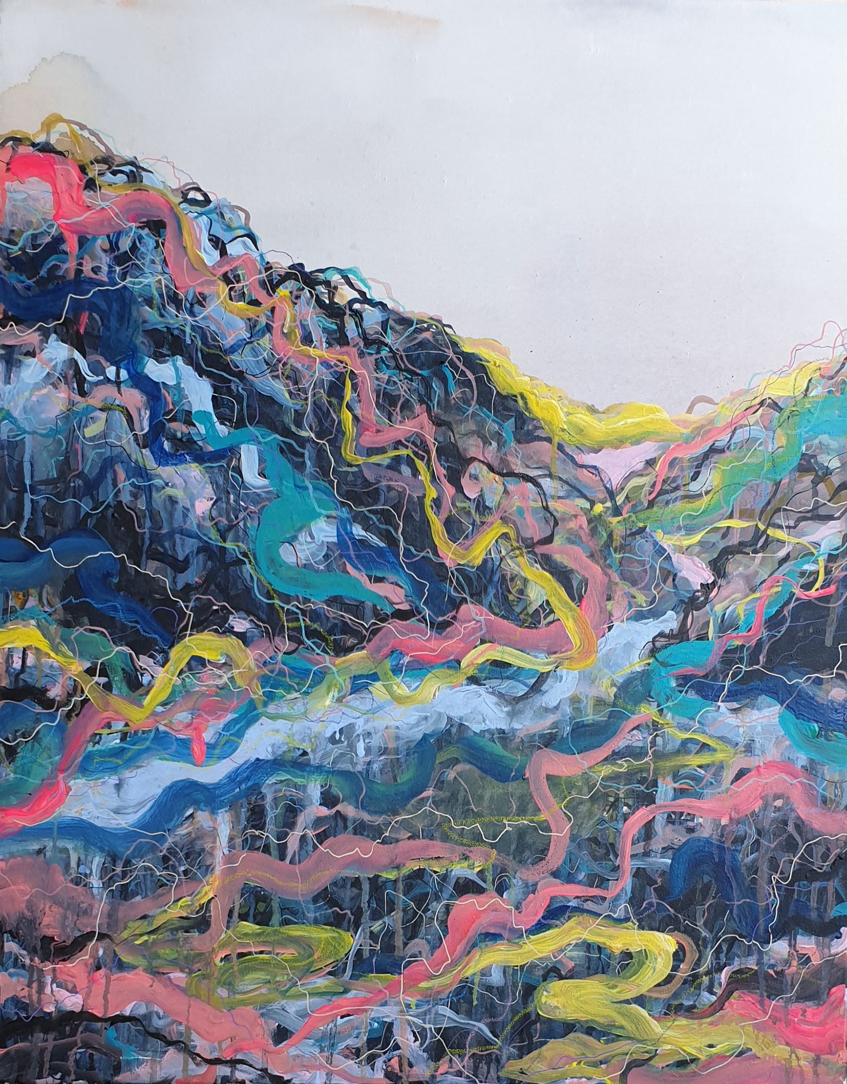 Reach of Sunrise Through the Fjord by Leni Kae. FRAMED (white floating frame) and ready to hang. This painting draws on the poetic parallel between the external visual landscape and the internal emotional experience. As sunrise and light pours through a fiord, there is a sense that it calls on viewers to witness a new day and breathe in new possibilities; to reflect on the travels and new experiences hidden beyond the fiord and cliffs. This abstract seascape painting is from Leni Kae’s new series titled “Flowscapes”.