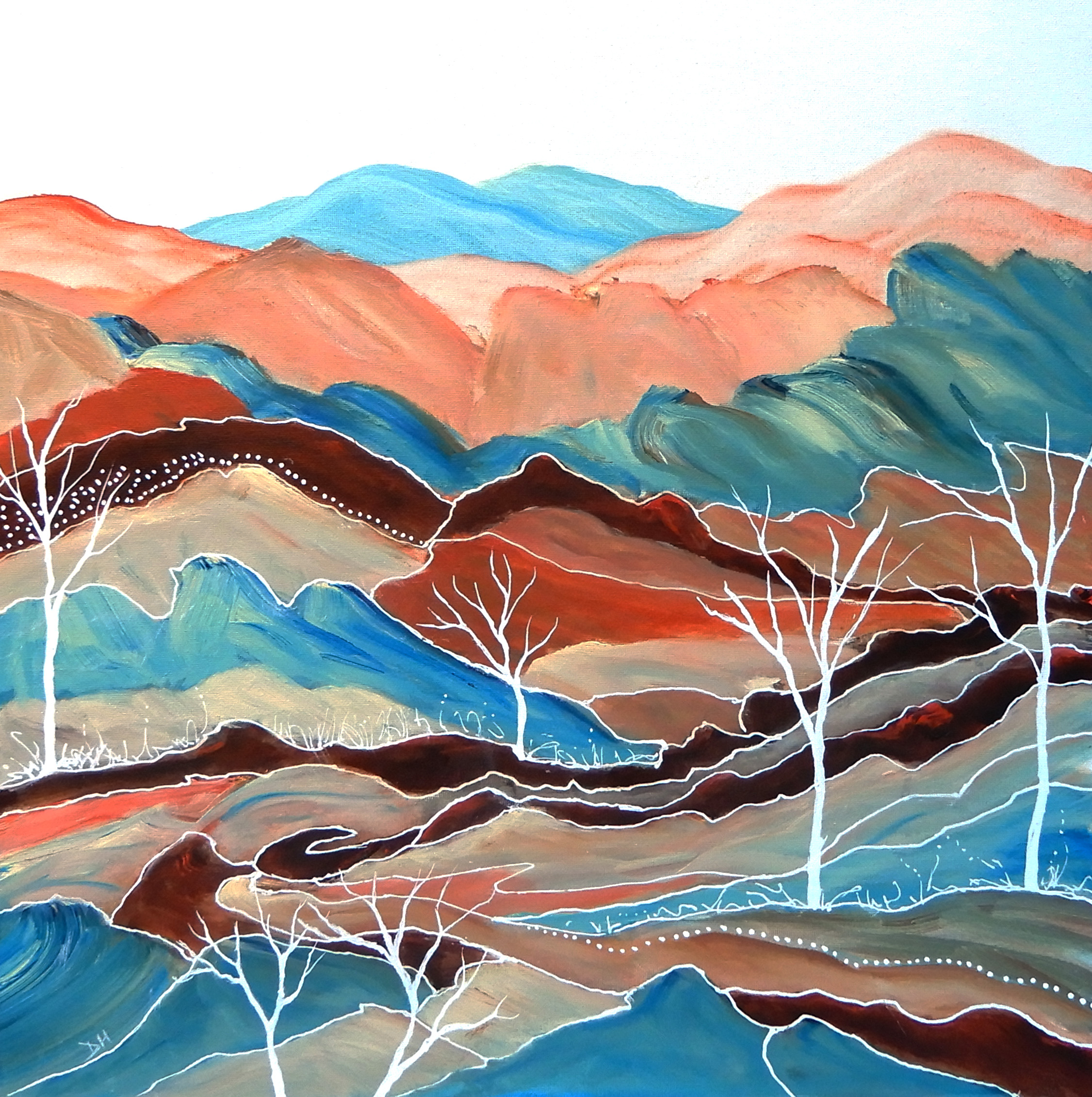 This abstract landscape is an imagined inspiration from the Red Centre, exploring the rhythms and dramatic forms around Mparntwe.