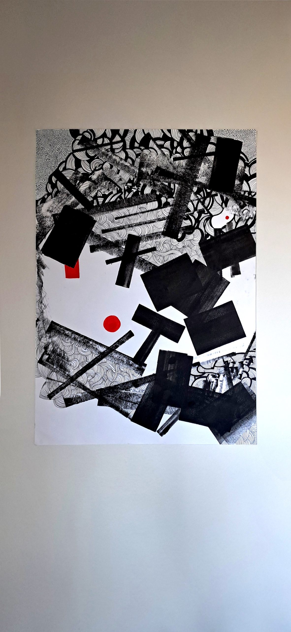 The original white sheet, which was used as a printing substrate and was supposed to be thrown in the trash, is rebirth. Rebirth involves two elements, red and blue, which reunite for the future.