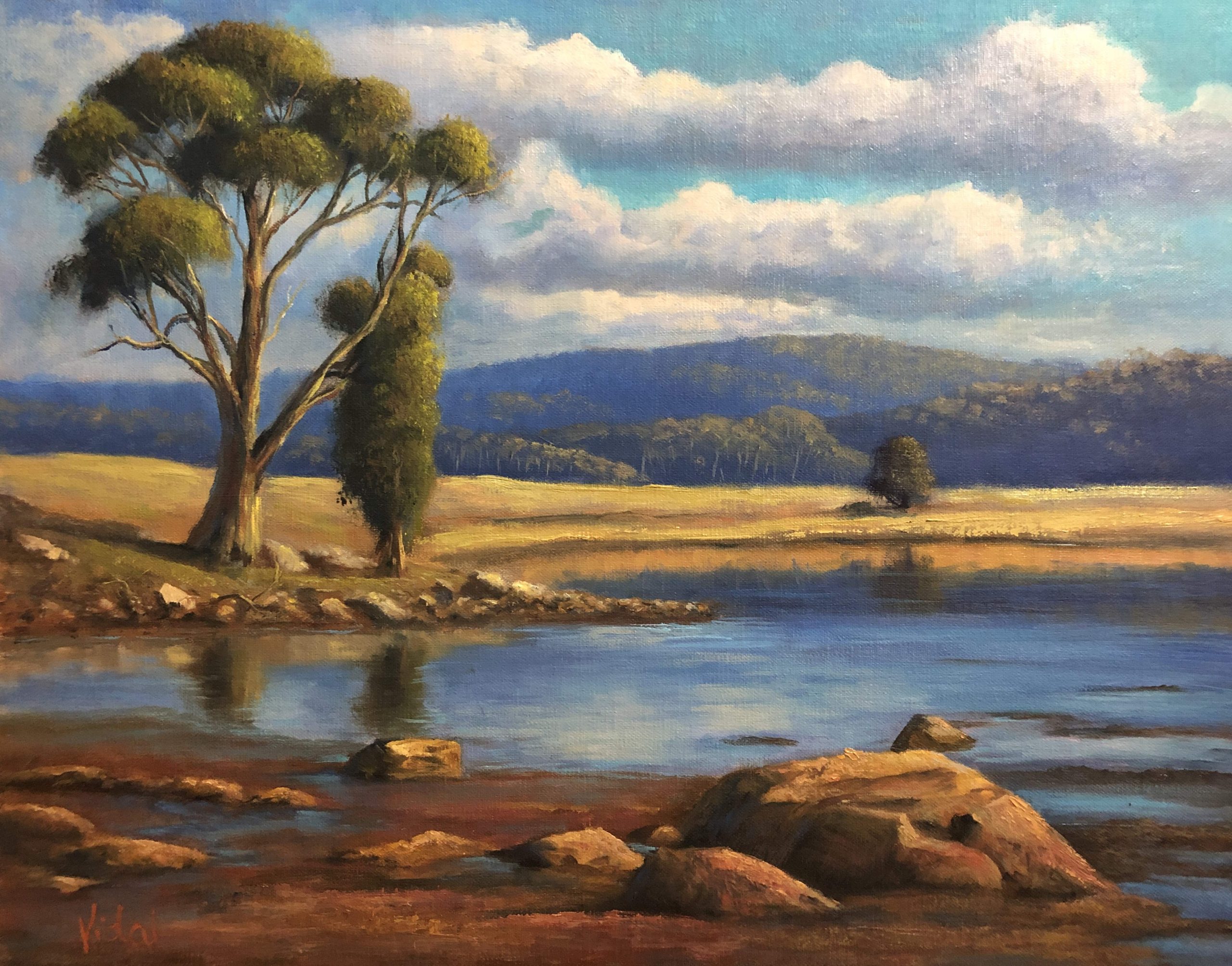 The receding flood waters contrasting with the golden colours of the sun burnt country.