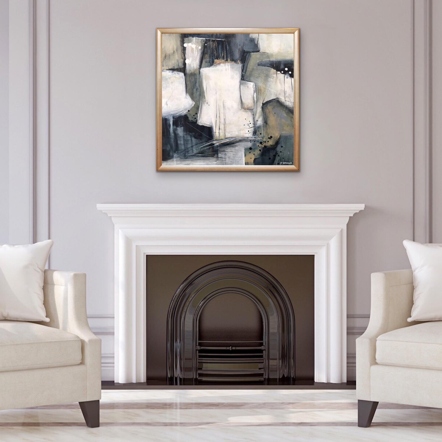The strong brushstrokes of deep greys are balanced with the softness of the whites and creams. Subtle lines and streaks adorn the canvas adding form and balance linking these wonderful colours together.