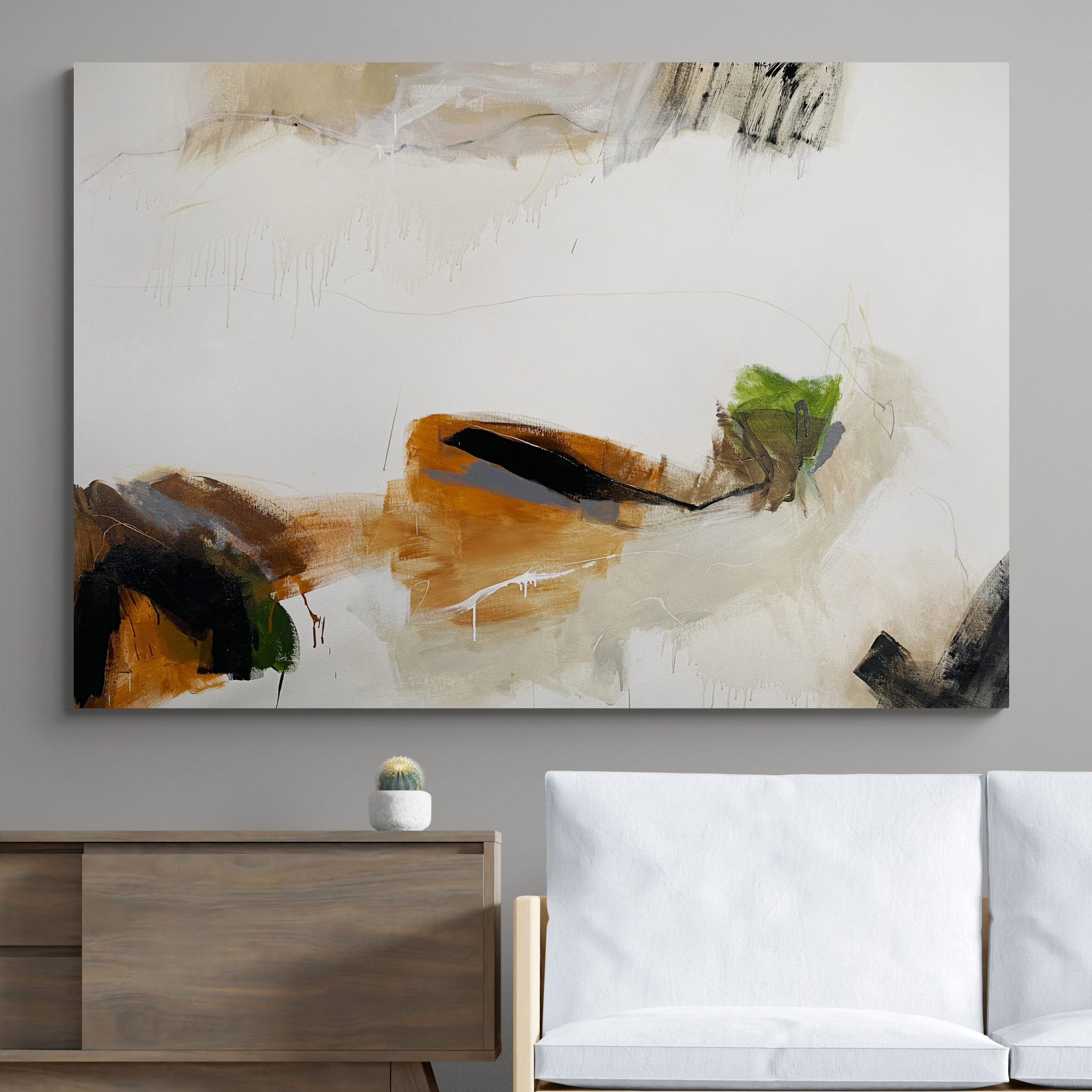 Its striking palette of light green mixed with rich ochre, beige, grey, and earthy tones ties together beautifully against areas of black and white which makes this piece come alive.