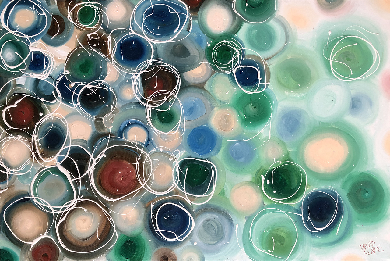 Red And Green Pebbles by David Clare – The start of my new series of paintings of abstract pebbles in shallow water. Highlighted by circular drips of paint. These particular colours have a retro 70’s feel to them.
