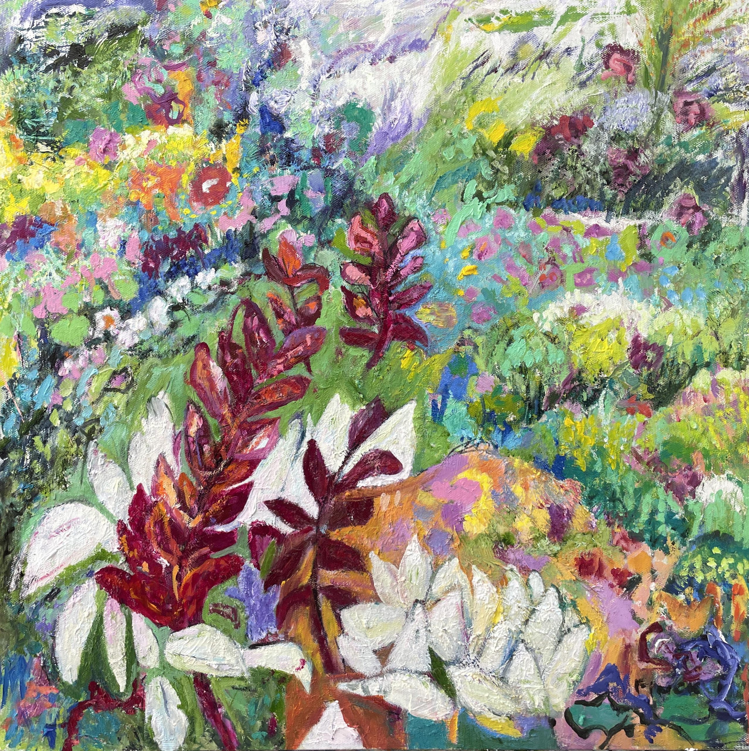 The origin of my painting was a mono print from a paint palette – just splotches of colour left at the end of a painting day. Then I saw an image of red flowers against white flowers, and took it from there.