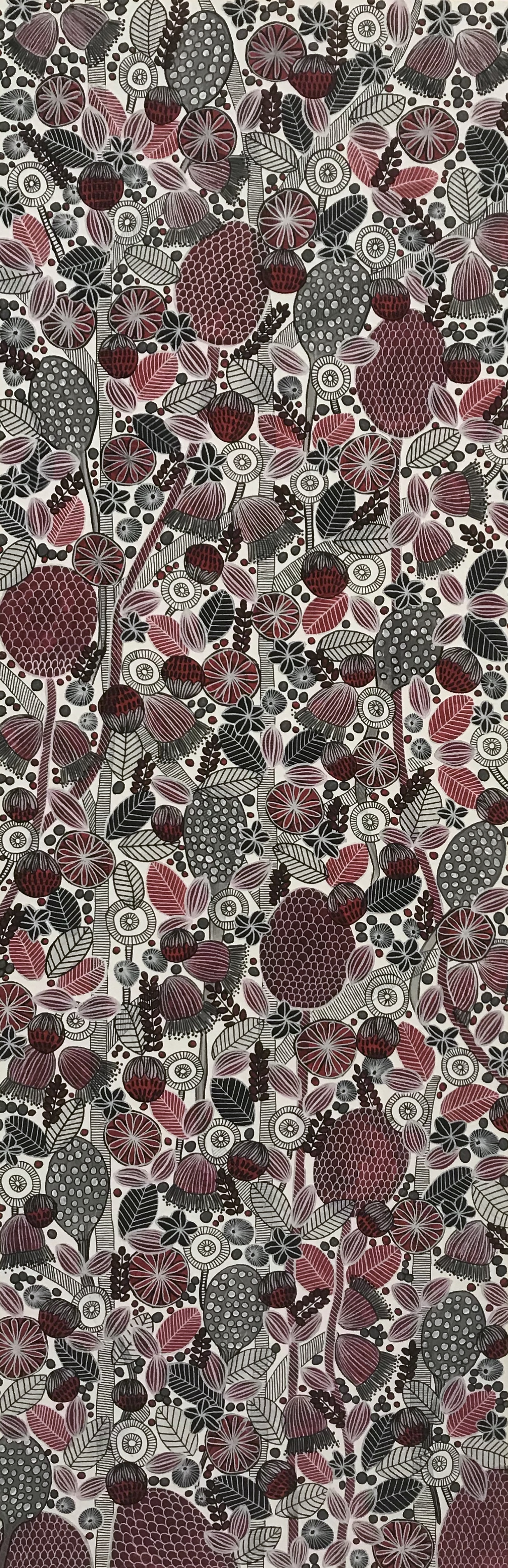 Different shades of reds, black and greys to form the different shaped leaves and blooms. The detail added within each shape with either white or black line work. Each shape and line painted and drawn by hand. No stencils used.