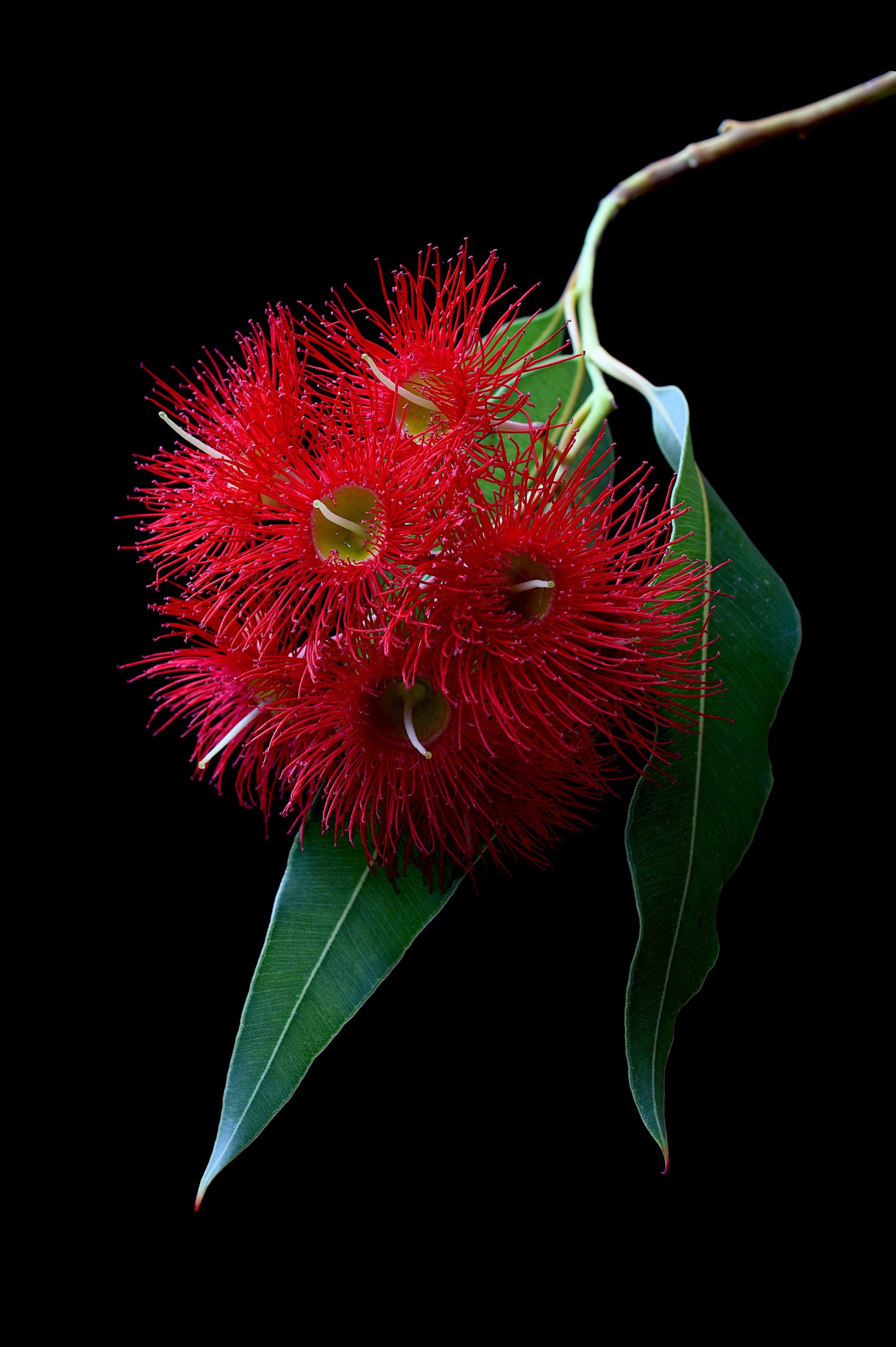 Beautiful crimson Gum blossoms with their strappy green foliage naturally lit and captured against a black backdrop. A still life botanical artwork for lovers of Australian flora in all it’s unique beauty.