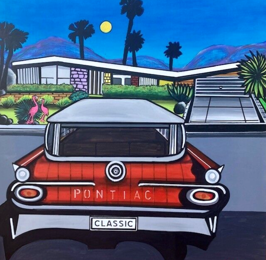 This vibrant pop art-inspired painting captures a classic red Pontiac parked outside a mid-century modern home, bathed in moonlight and framed by palm trees and playful flamingos. A nostalgic tribute to retro glamour and timeless design, this piece brings bold color, character, and a hint of escapism to any space. Originally exhibited at NSW Parliament House.
