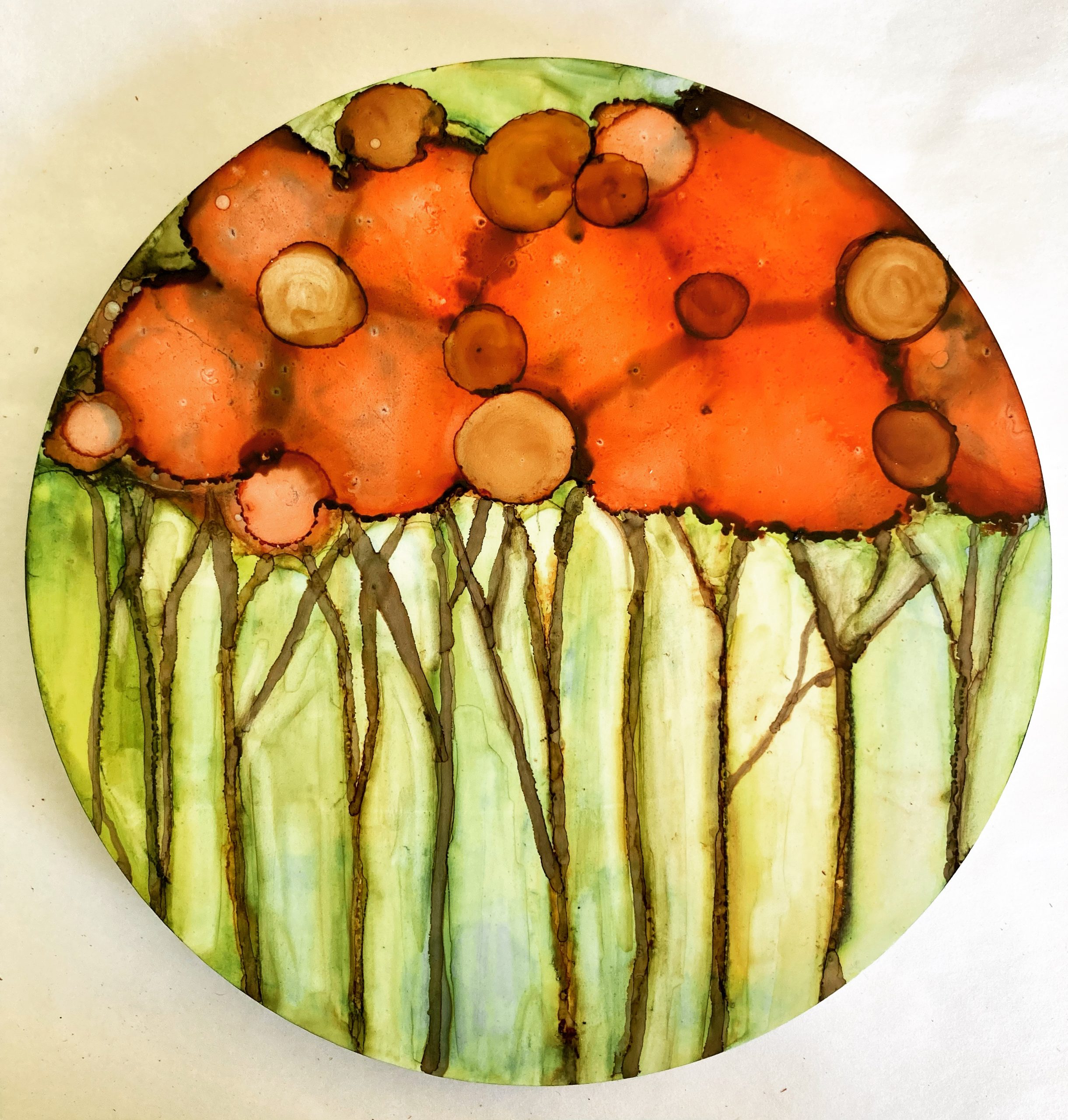 This painting is alcohol ink on a 16.5cm round composite disc. It has been protected with two layers of gloss Karmar varnish to bring out the bright colours. A small display easel will be included for displaying this small treasure in a shelf or on a desk.
