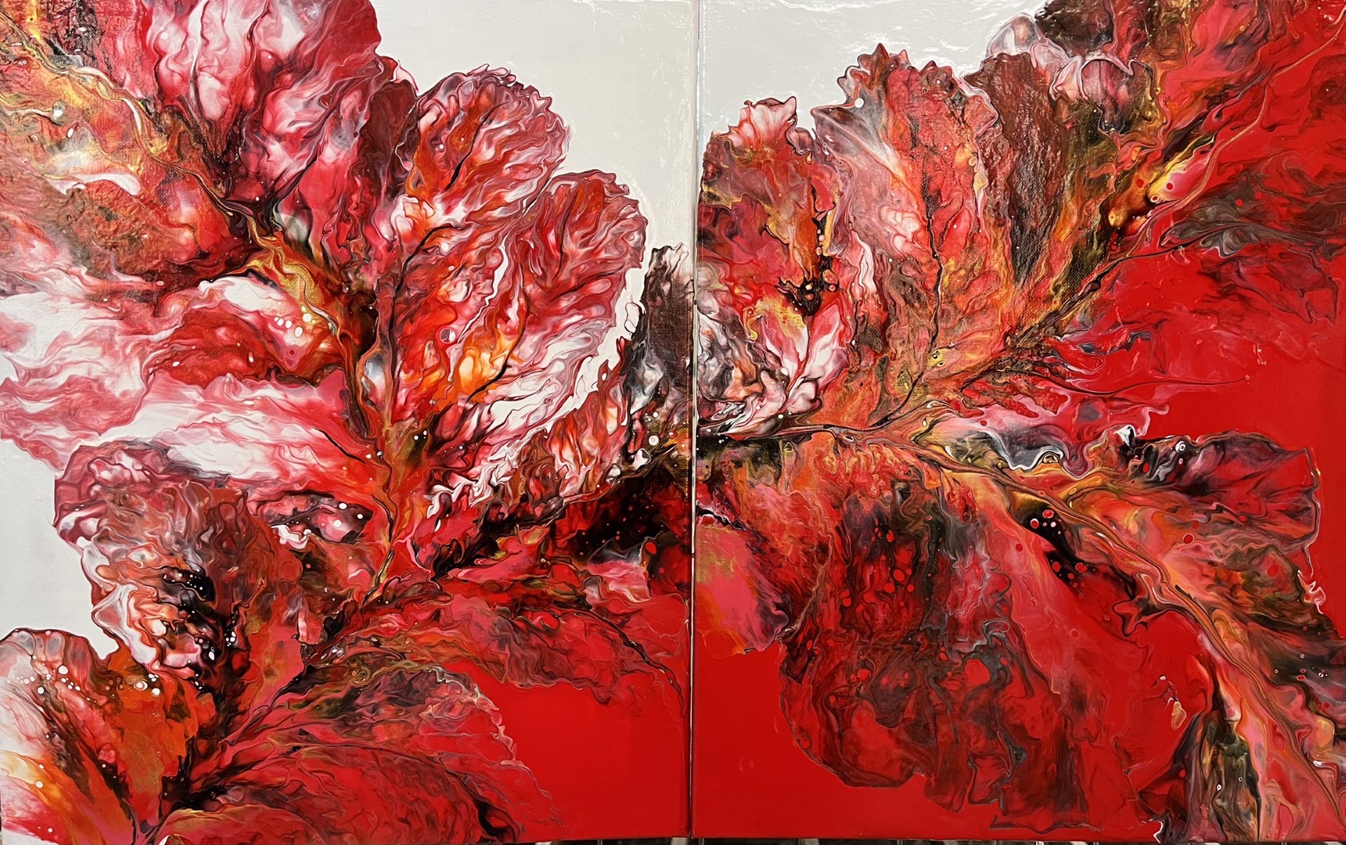 “Red Hibiscus” by Marina – Â is an expression of decorative wall art, individually hand-painted in Brisbane. It was painted on two separate canvases stretched on pinewood frame. Each piece’s dimensions are: height 50cm, width 40cm (total width – 80cm if pieces are placed together). This is an original; there are no prints made from this work.