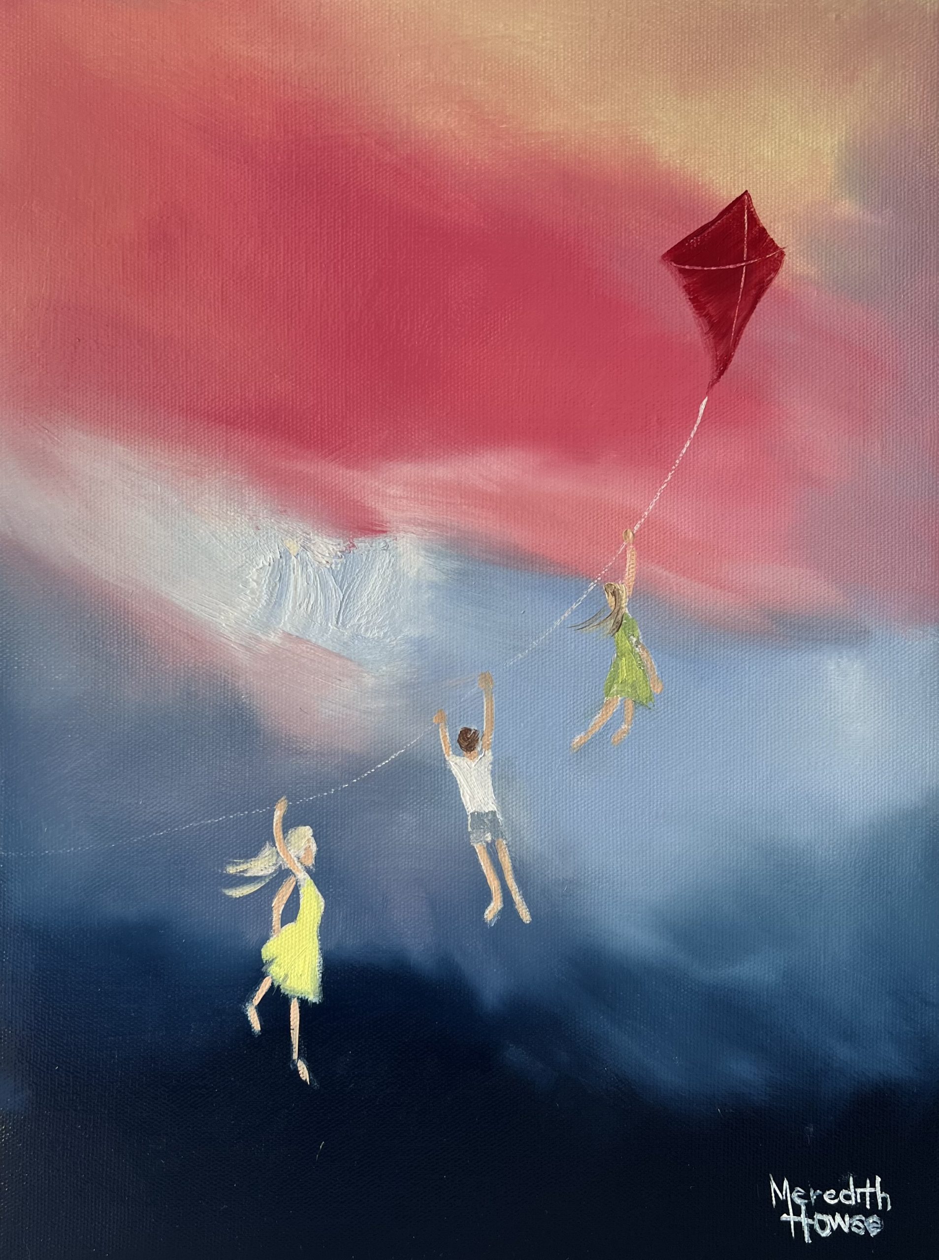 In Red Kite Away by Meredith Howse the artist uses a palette of pinks, yellow, blues, and greys, to bring the scene to life.
