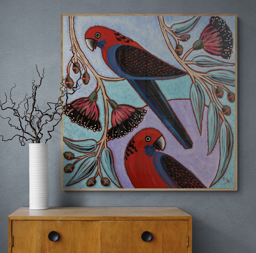 I was doing research on Crimson Rosellas for this painting and read that ‘Crimson Rosella’ only became their official title in 1926 – prior to that they had numerous titles