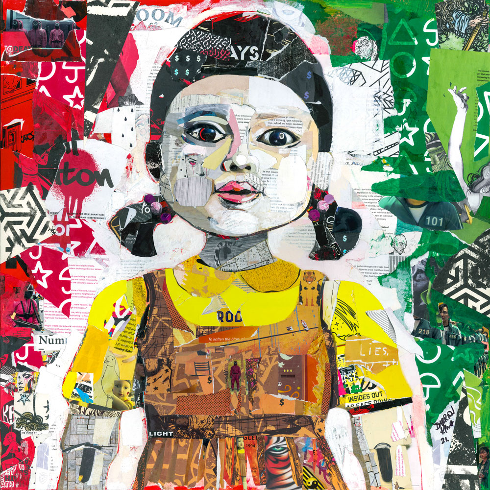 Red Light, Green Light by Darren King –Â Squid Game inspired colourful mixed media collage on wooden board. This piece is inspired by Squid Game, the Netflix, South Korean survival TV series. If you don’t know the series, you should. This giant doll plays a brutal, unforgettable roll in the series.