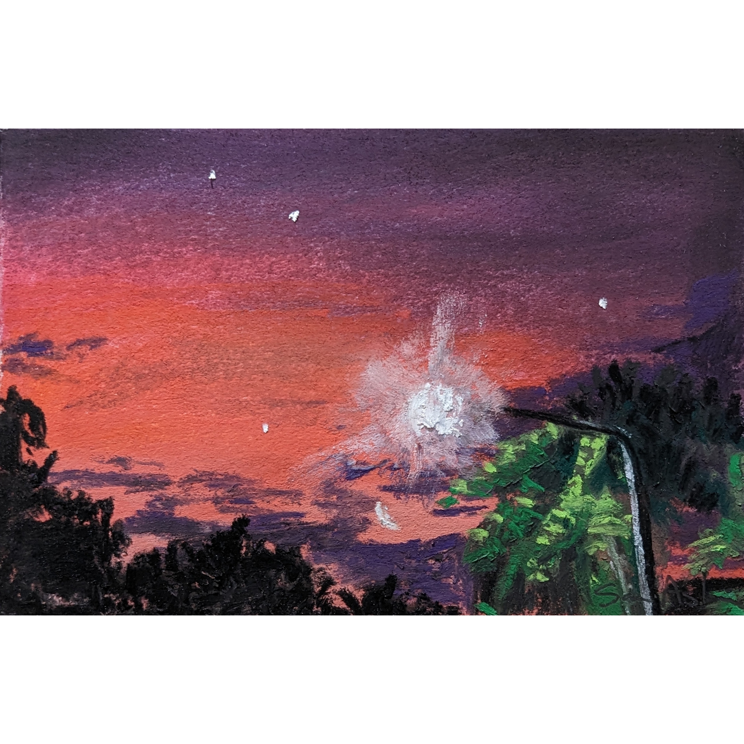 Just after the rain, comes the beautiful sunsets. As the dust from the air is settled by the rain, the sunsets change to a brilliant pastel mix of reds, pinks, purples and oranges each night. I am always fascinated by the backdrop of nature with cityscape features such as the streetlight in this piece.