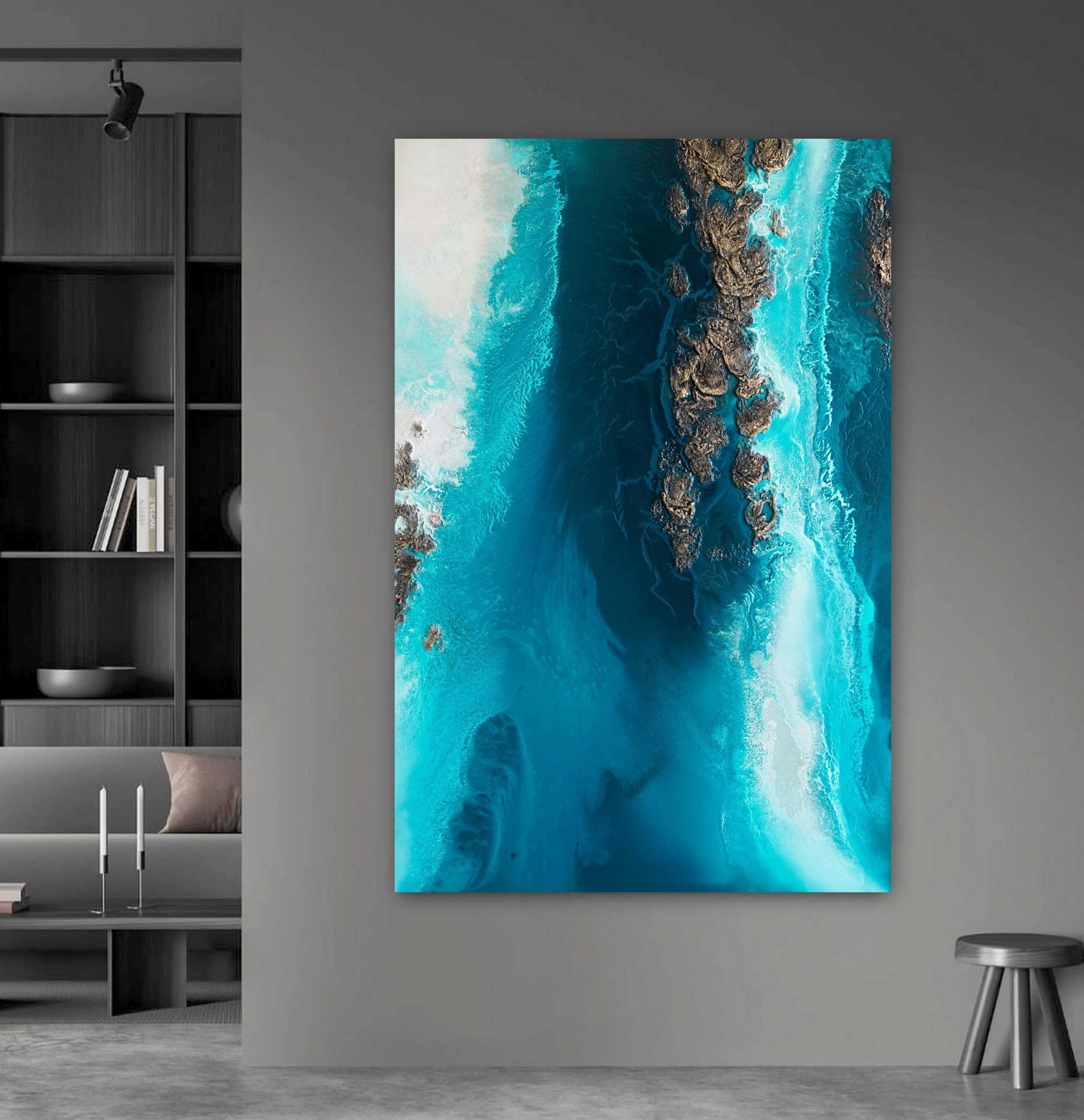 Teal Abstract Wall Art “Reef Majesty” by Petra Meikle de Vlas – is a highly textured, 3 dimensional, abstract aerial view of the ocean.