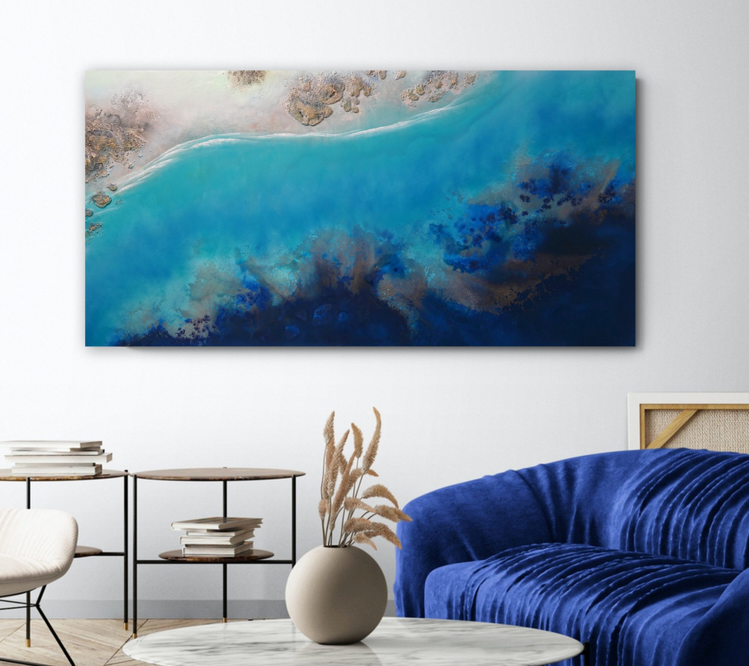 Blue Abstract Wall Art “Reef Rhapsody” by Petra Meikle de Vlas – is a highly textured, 3 dimensional, abstract aerial view of the ocean.