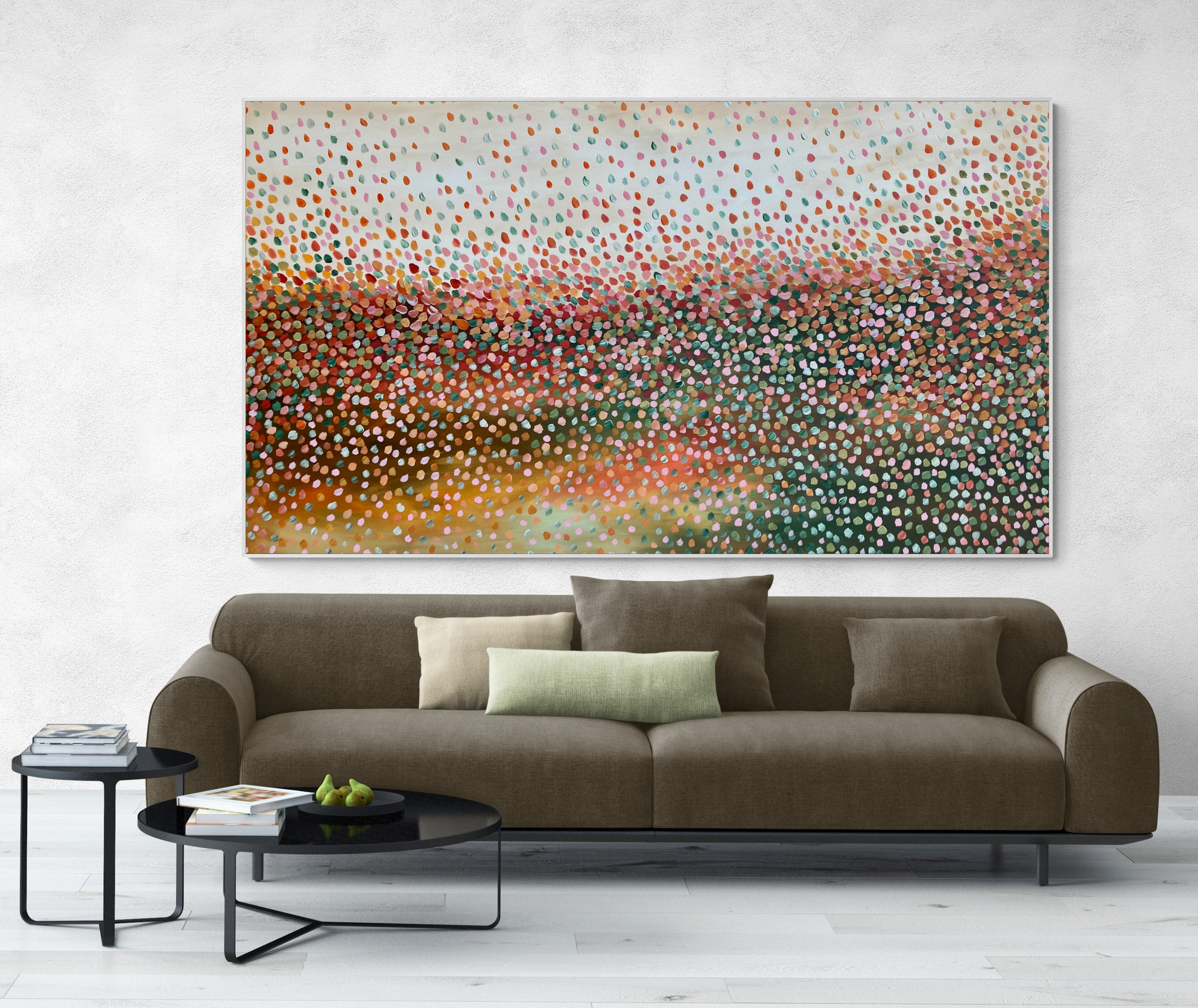 Reflect the Stars by Theo Papathomas a painting with soft colours of the petals flying in the wind creating this beautiful bouquet of petals covering the hills with lots of layers of paint. Beautiful flickering petals dancing over the landscape shining like stars. Petals weeping onto the landscape creating this veil of petals covering the hills in soft olive, pinks and earthy colours . A composition of colours and rhythms of petals dancing like musical notes in the sky making this painting very gentle and poetic painting . A very peaceful and tranquil painting with so much depth. The painting does not come with an external frame.The painting is signed and dated 2021 at the back and comes with a certificate of Authenticity.