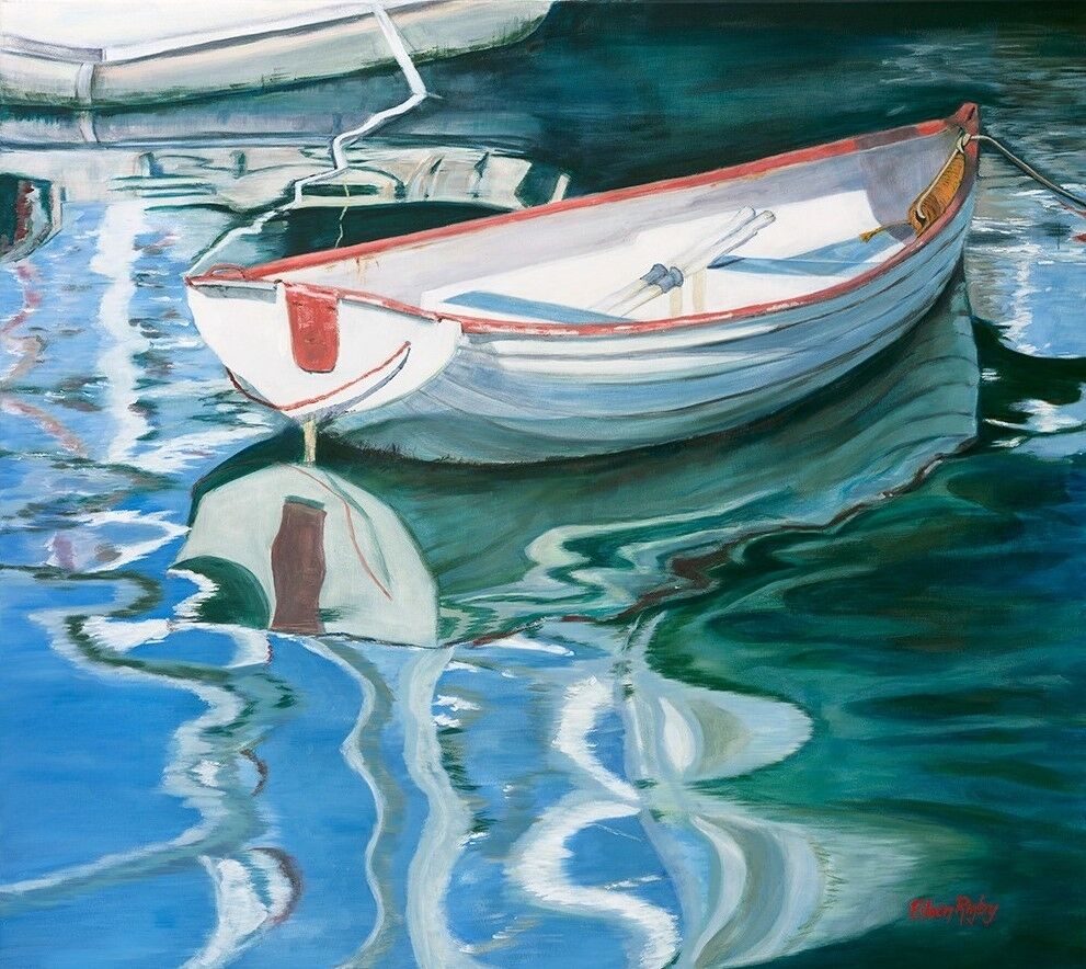 One sunny day I was inspired by the reflections of a little boat sitting in the harbour. I wanted to capture the feeling of freedom and well-being that I felt on that day. For those of us who have been ‘confined to barracks’ during these past many months this sense of freedom, that being near water brings, is encapsulated in this painting.