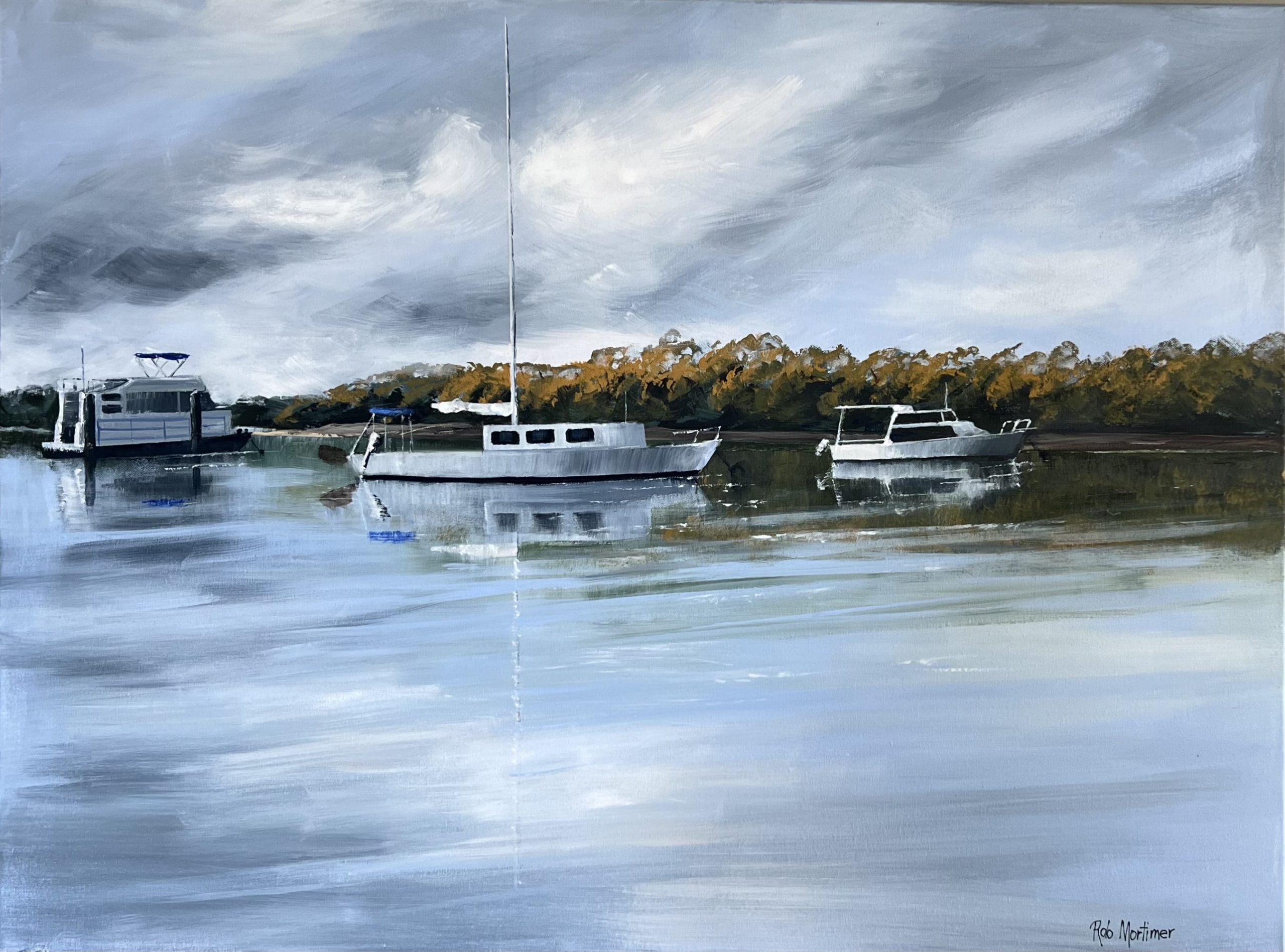 Original. Acrylic, on stretched canvas. The boats reflecting in the still morning water. Protective clear coats – Hooks and wire across back. on quality stretched canvas.