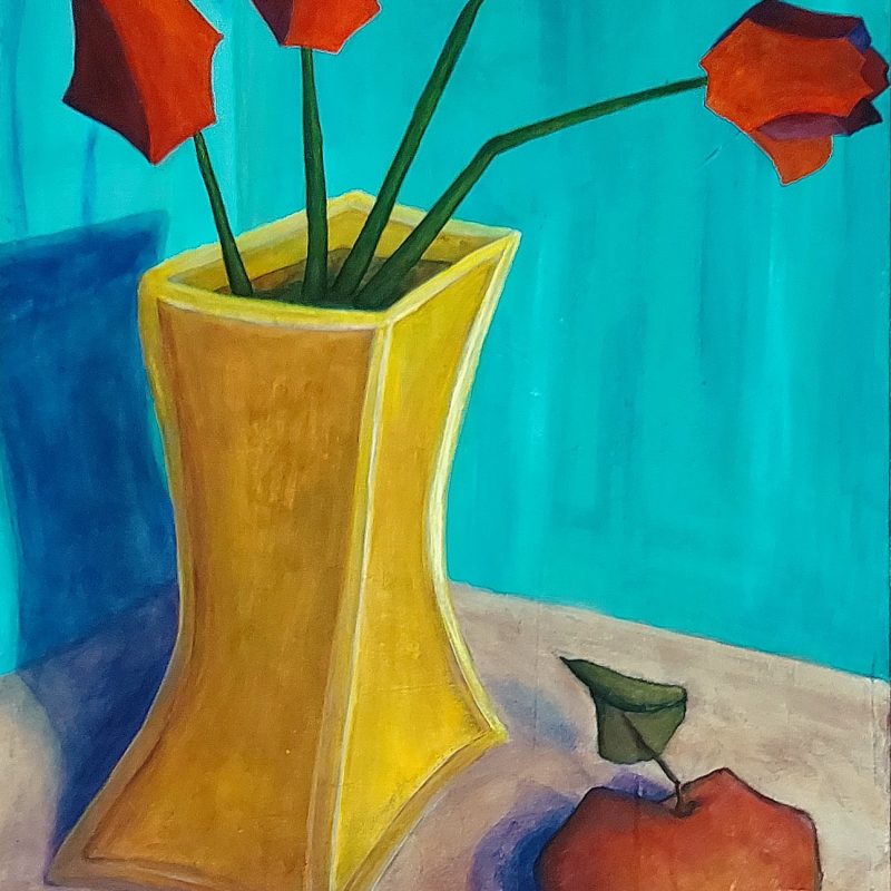 This landscape in mixed media has gone through many processes to arrive at its abstracted form. The underpainting was thickly applied in deep tones in an impressionist style with areas of collage added then more acrylic glazing layers also applied.  Finally selecting areas to erase with abrasive materials, adding back in the odd line and shadow before adding a final clear varnish.