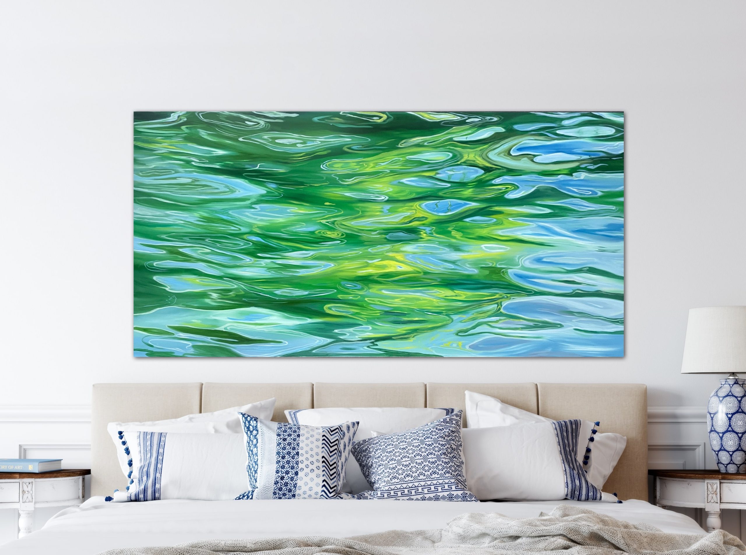 I find light reflecting off the sea, lake or swimming pool so inriguing and calming and I hope to bring that sense of emotion to your space with this artwork..