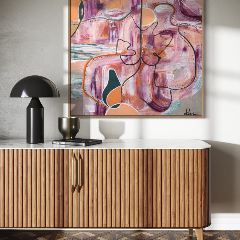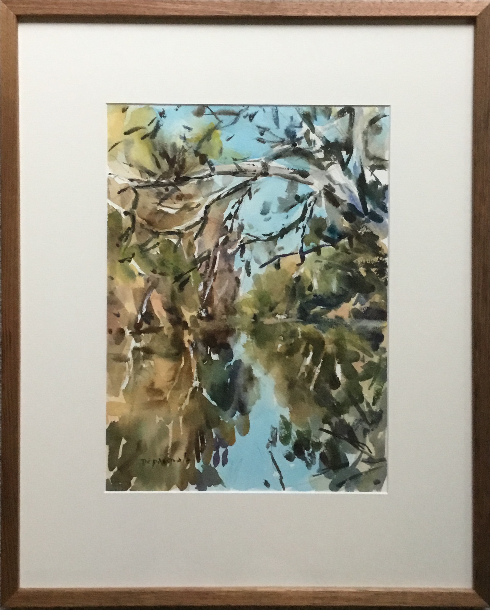 “Reflections Wetlands“ by Faye De Pasquale –  is a freely executed, Watercolour on top quality Baohong Watercolour Paper framed walnut timber box frame soft white mat ,UV conservation glass.