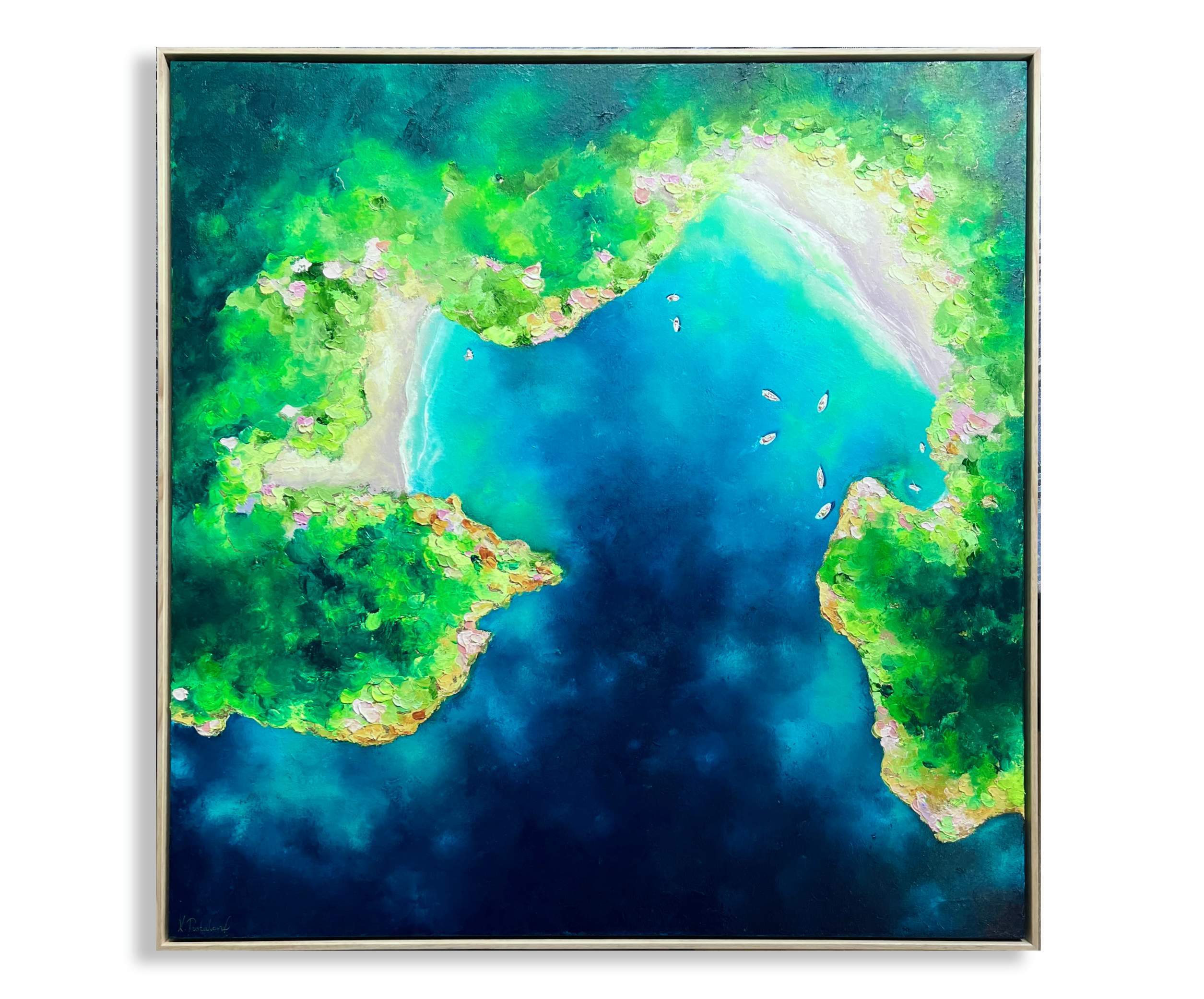 Some of my canvases are ordered with a float frame, usually the most popular is a Tasmanian oak frame. If you prefer to frame the piece once the painting is finished, I can assist you in organising a custom frame or you can choose to arrange framing yourself.