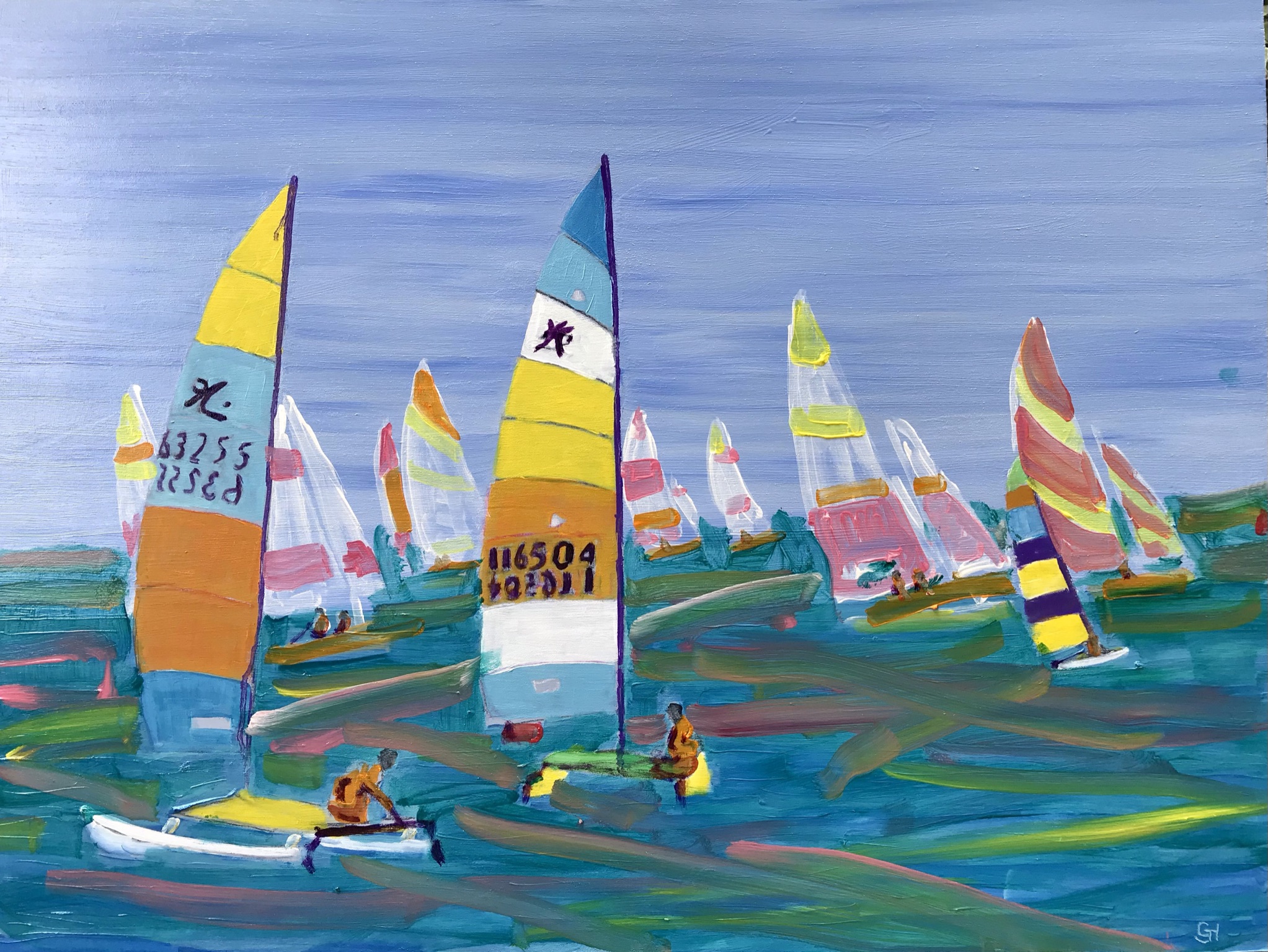 In the mid 70s I worked in Newcastle and joined the Newcastle Catamaran club. we sailed at different places around Lake Macquarie and even also raced offshore from Newcastle Harbour to Swansea return.. I sailed my cat every day i had off from work. This is a fun interpretation of a fleet of Catamarans., oil on wood panel