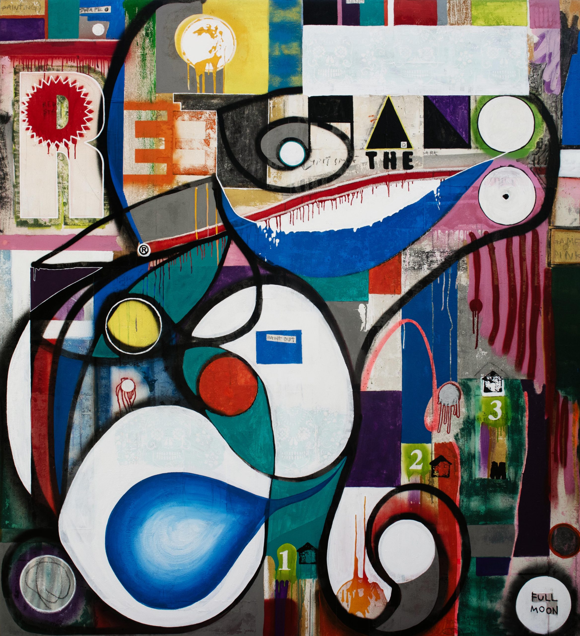 Rehang the Dream by Rehgan De Mather Mixed media – acrylic, spray paint, oil stick, and charcoal on canvas.
