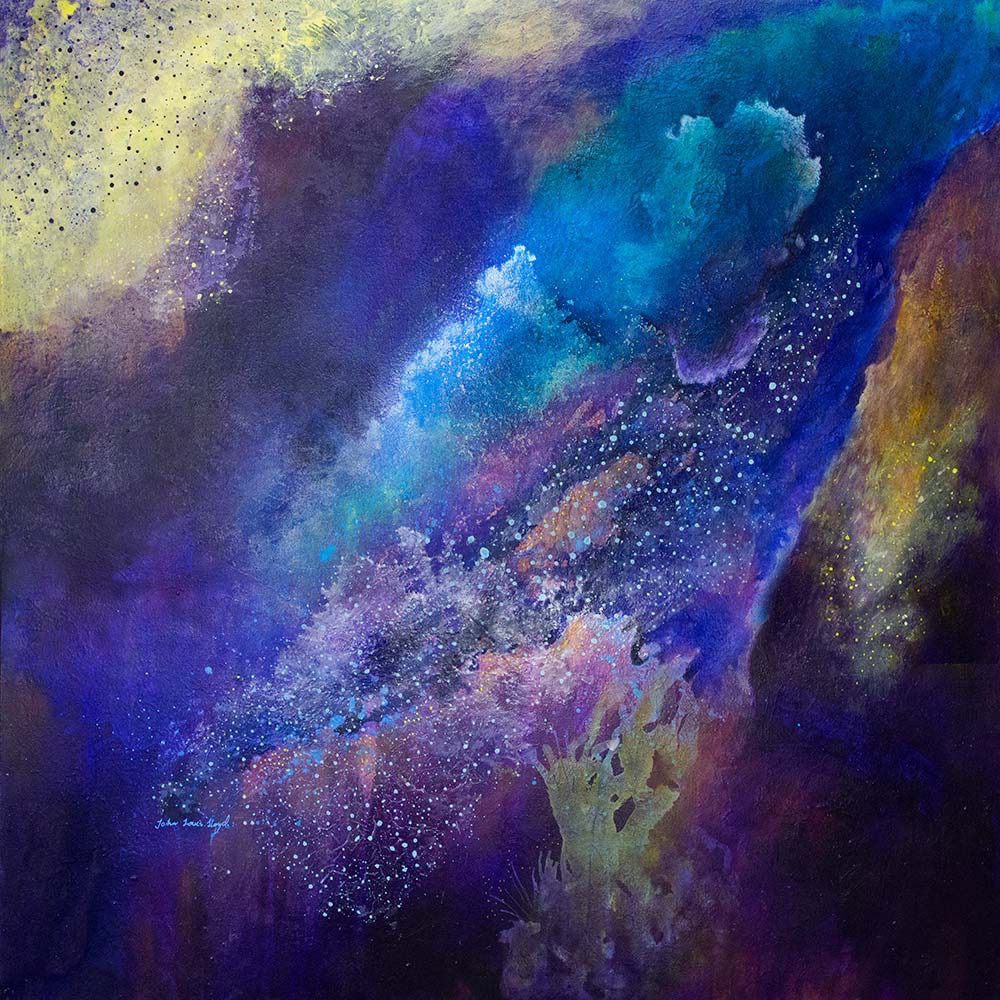 This engaging abstract painting presents an ethereal, cosmic landscape, dominated by deep, velvety purples and radiant blues that flow across the canvas in a sweeping, diagonal motion. The piece evokes the sensation of a nebula or galactic cloud, with bursts of turquoise and cerulean suggesting areas of energy or movement. The application of paint is both fluid and textural, with layers of colour blending seamlessly into one another, occasionally interrupted by speckled white droplets that mimic the appearance of distant stars or cosmic dust. The upper left quadrant transitions into warm golden hues, adding contrast and suggesting a source of celestial light or creation.