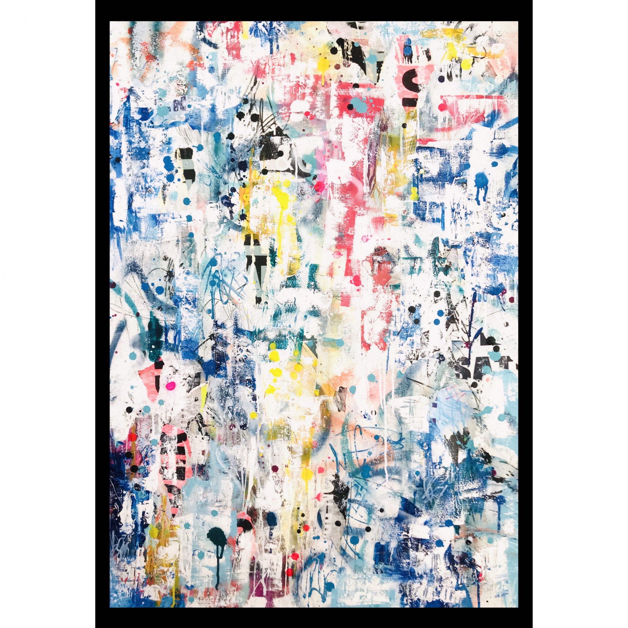 This artwork has a very textured finish created by built up layers, paint splatters and torn paper, a visual effect mimicking the look you would see in the street where this effect is created over time on Graffiti Walls & Advertising Spaces. These imperfections are part of the overall look and feel of the finished work.
