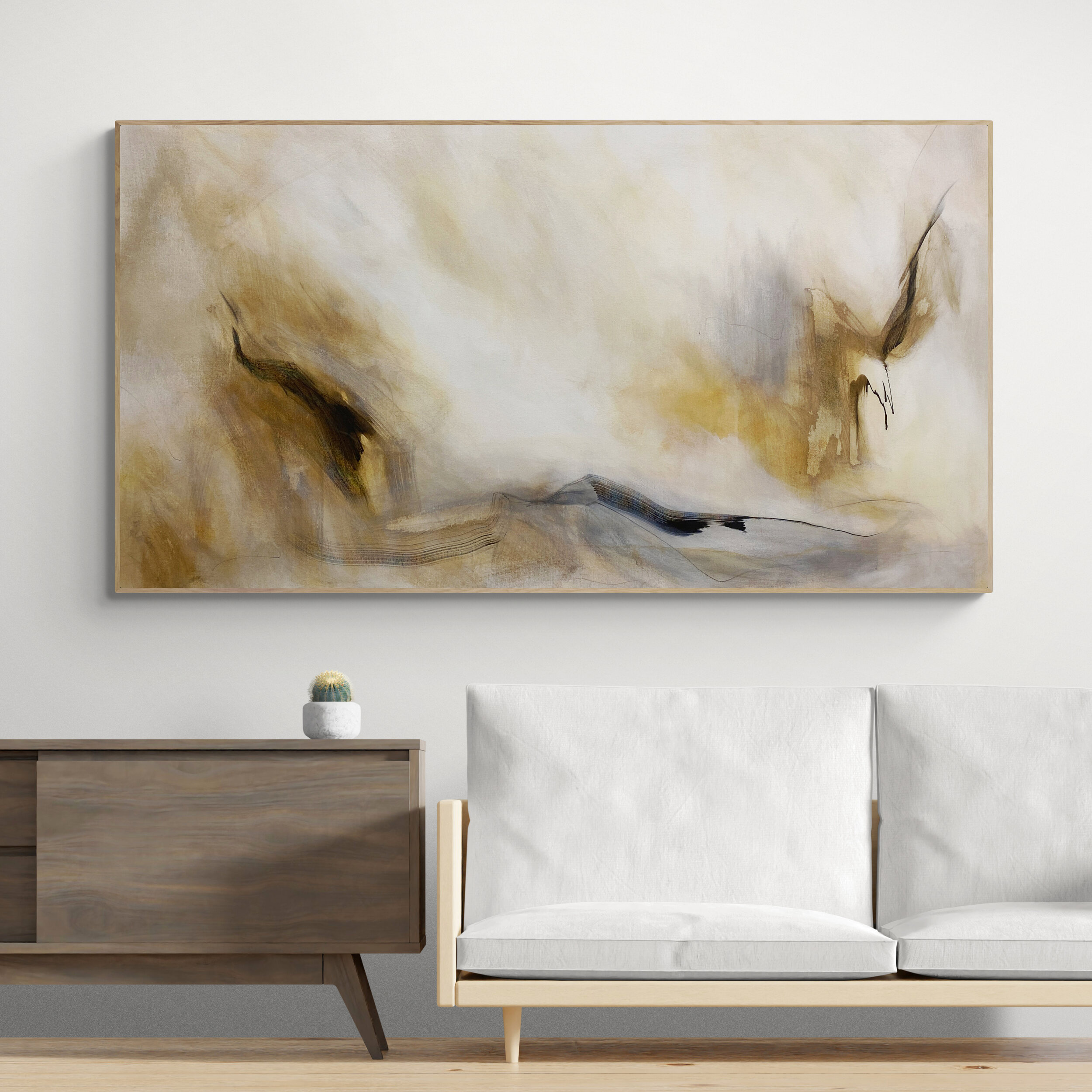 Its vibrant palette of light warm beige, ochre and browns, grey, black and white makes the bold mark-making in this piece come alive.