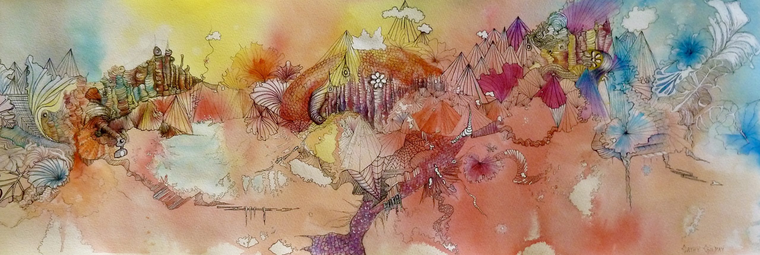 Remnants by Cathy Gilday – Ā Remnants was created slowly, over a period of time. It is one of a series of fantasy landscapes I have done, that I liken to being taking on an unknown journey, not knowing exactly where I’d end up. I began with a wash of colourfast pigmented inks and then allowed my imagination to create intricate shapes and patterns. In this case, an undulating sprawling settlement of pitched teepees, nestled in amongst giant flowers and fluffy white clouds. I have framed the artwork, behind glass, with a double border mat and white frame as seen in images. Measurements including frame,Ā 84cm x 37cm xĀ 3 cm.