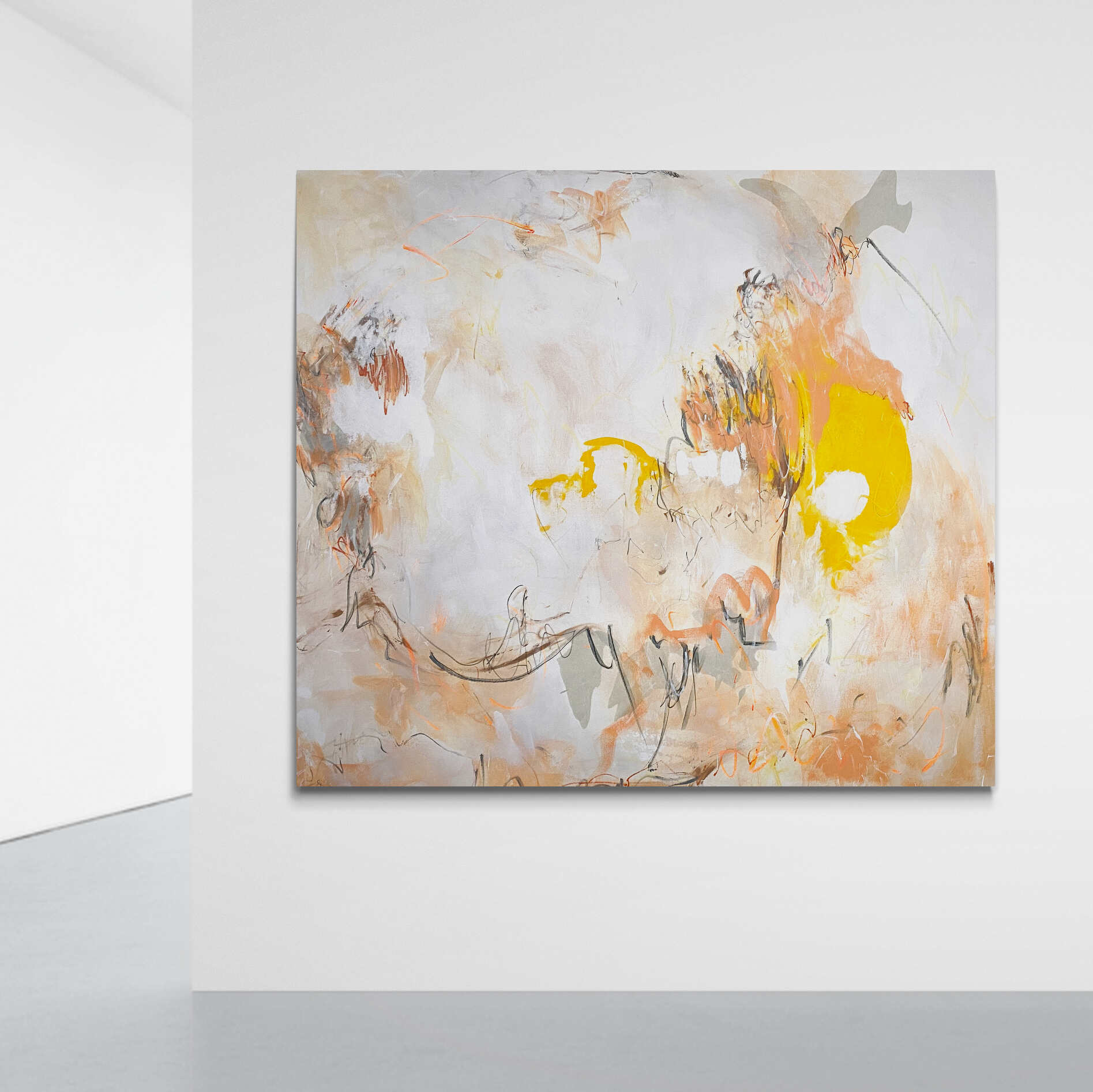 ‘Renaissance’ is an original painting by Cheryl Harrison. This captivating layered artwork is made all the more intriguing by the bold and intuitive mark-making and striking palette combination of light yellows and apricot, orange, white and grey. It really is a fantastic statement piece that would pop in any large space.