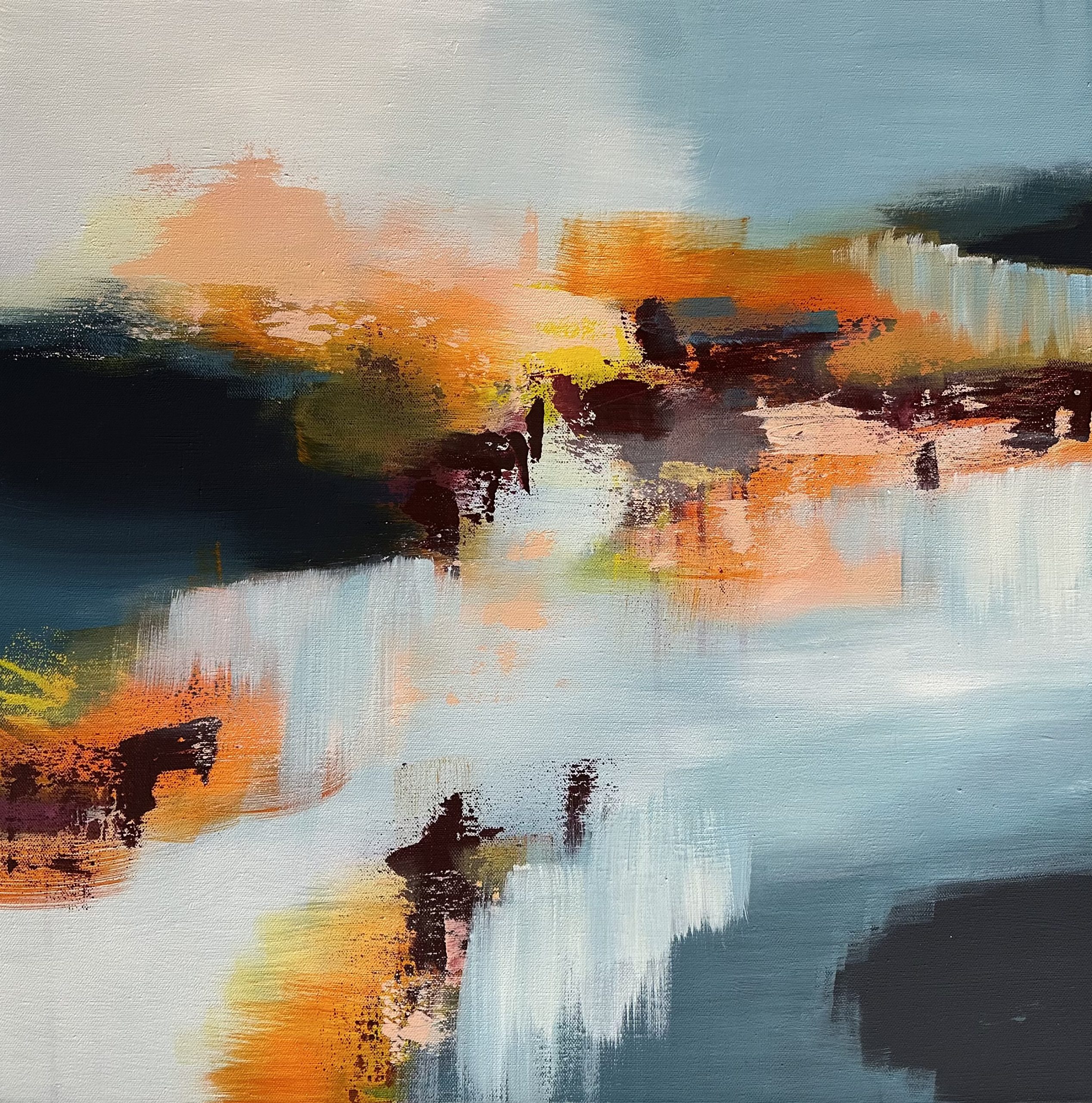 “Resilience” is an evocative abstract artwork that captures the essence of strength and endurance through a dynamic interplay of colours. The piece is dominated by stormy blue tones, representing challenges and adversity.