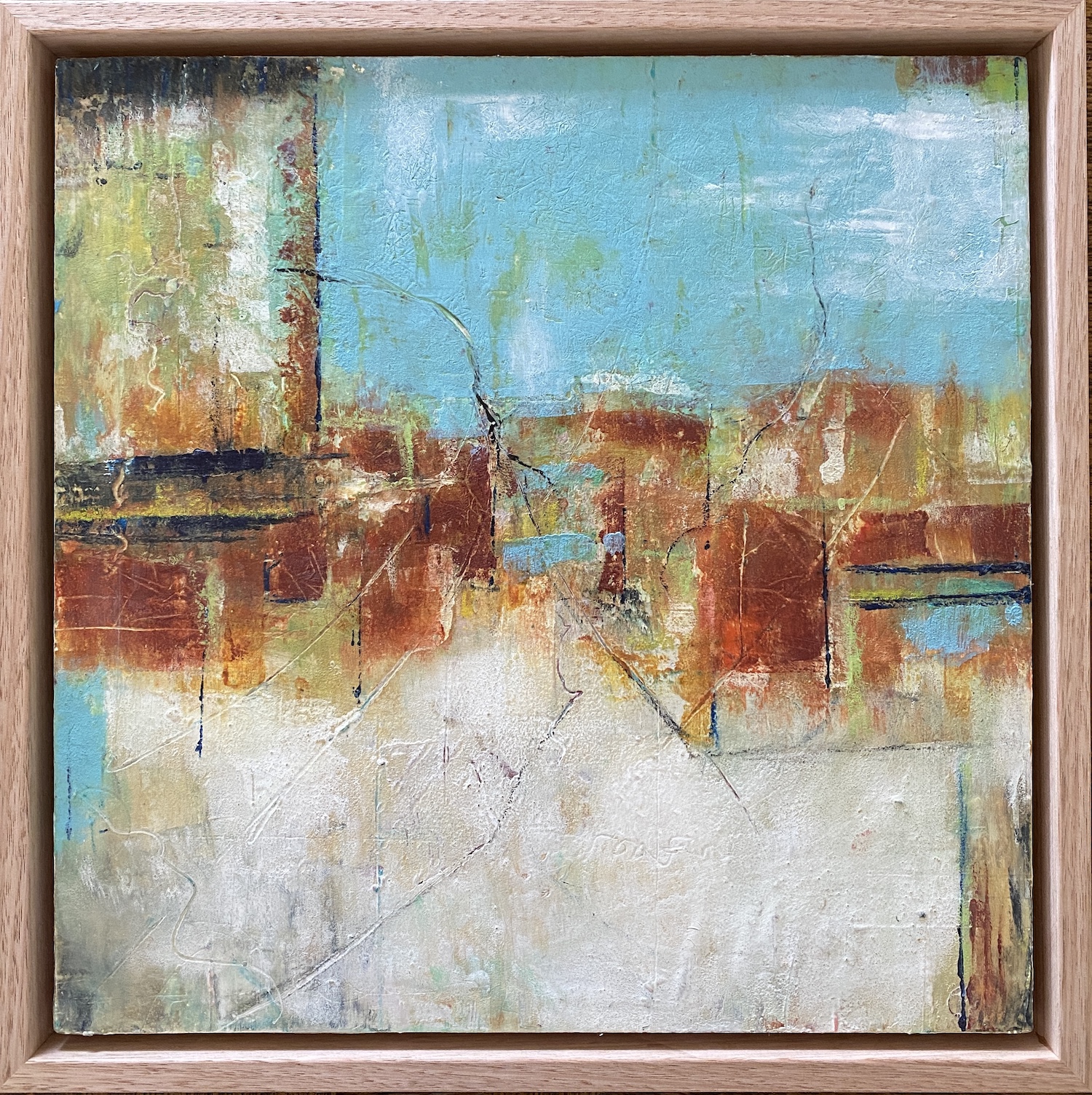 This collection embraces my love of the natural world and how it helps to heal if we take time to be amongst it and absorb its beauty and spellbinding power. Leaving behind a feeling of burnout, overwhelm with debilitating migraines and being in the present in nature is represented in these abstracted visions I see and feel. Working with cold wax and oil on wood panels allows for beautiful texture and depth to shine through. Framed and ready to hang in raw Tasmanian oak float frame. One in a collection of 5.  The size includes frame.