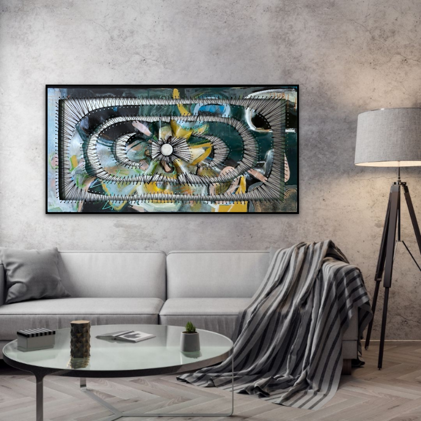 Multi mixed media and 100% wool crochet string on canvas