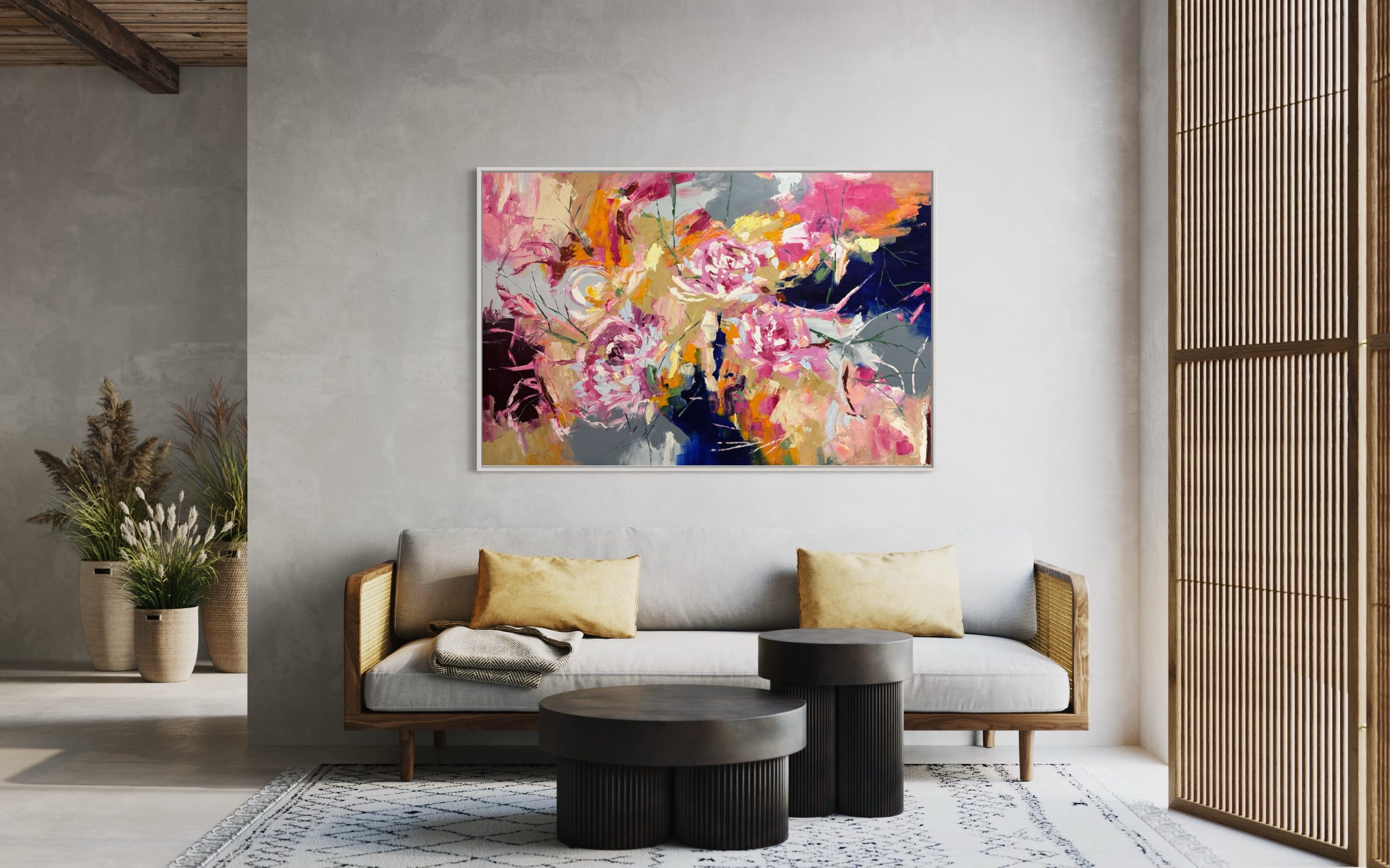At the center of the composition, three enormous abstract pink flowers emerge, symbolizing the delicate yet resilient nature of existence. Each brushstroke and palette knife mark adds depth and character to these magnificent blooms, reflecting the complexity and beauty found within the human experience.
