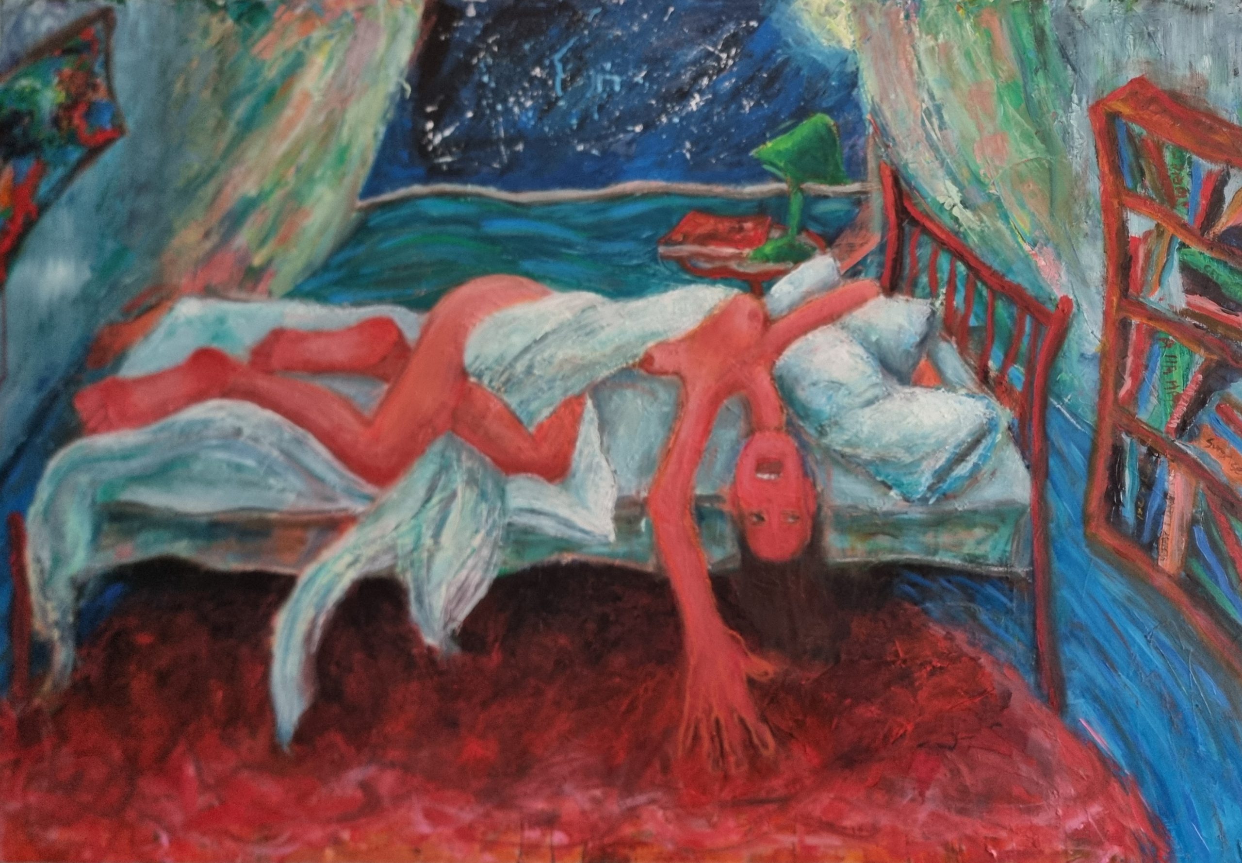 In this piece a woman tosses and turns in bed, her form caught between exhaustion and desperation.