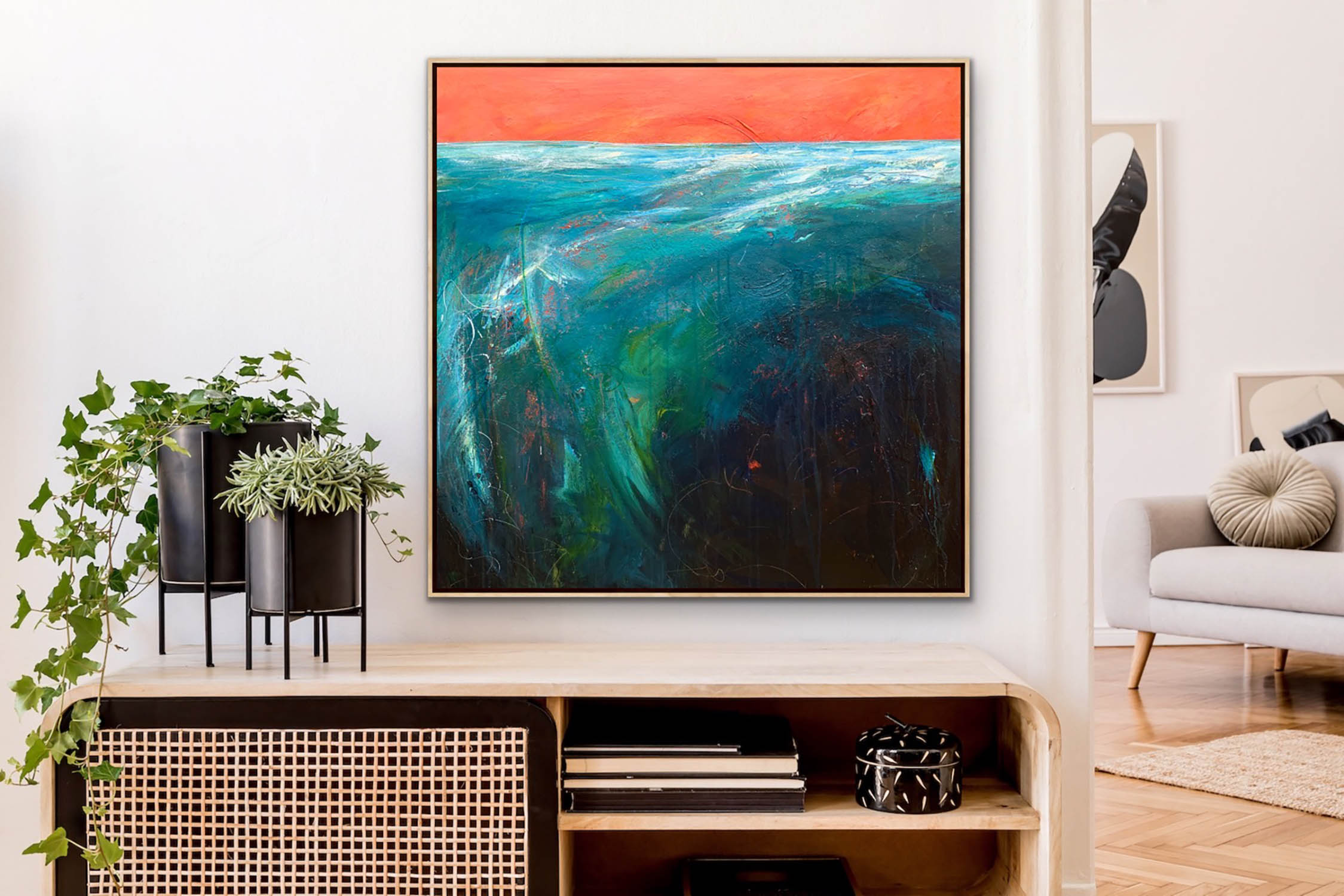 Restless Bay is inspired by the Australian summer sky. Due to the extreme weather conditions we recently experienced the sunsets beauty was unfortunately foreboding. None the less there was a stillness and peace that contrasted starkly with the fury that followed. Poet Nathaniel Hawthorne said: “The Ocean has its silent caves, Deep, quiet, and alone; Though there be fury on the waves, Beneath them there is none.” Layered acrylics and inks on stretched canvas. This painting is double glazed and is finished with blackened edges and is ready to hang. The Artwork is stamped on the front, and signed and dated on the back, and will be securely packaged for your peace of mind.