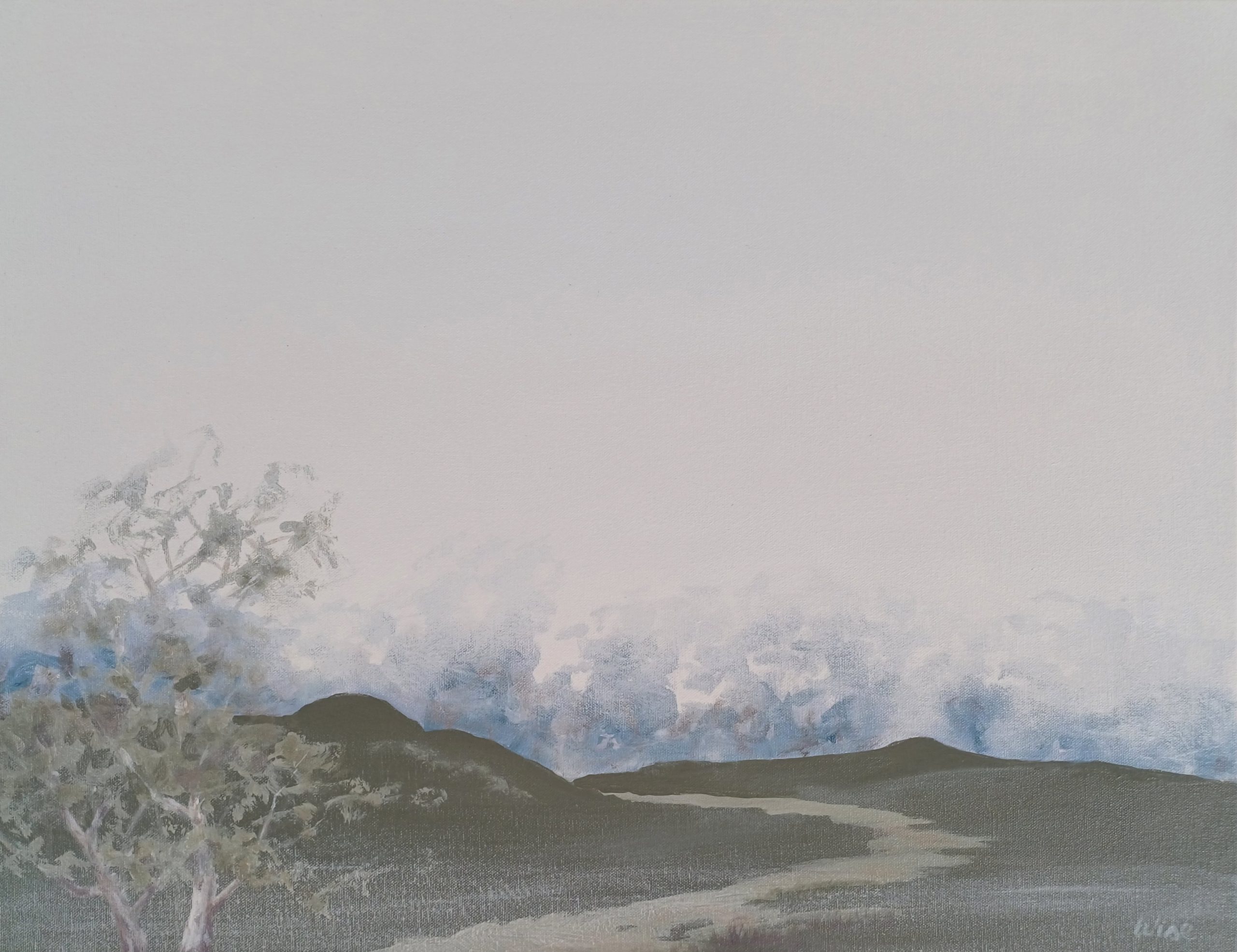 Retreat 3 by Kate Wise – Retreating to a quiet spot under a tree or a hilltop with a view can reinvigorate Kate’s creative spark, replenish her energy and inspire fresh ideas. We don’t all have the time or resources to retreat into the healing sanctuary of nature. So Kate has created this new series called ‘Retreat’ to give you (and herself) beautiful moments of quiet contemplation as your eye wanders over these paintings. In this painting, a pathway beckons you from the open plains toward the sanctuary of the distant bushland. ‘Retreat 3’ harks back to the open vistas of Arthur Streeton. Kate’s colour palette, inspired by Clarice Beckett, is deliberately muted to enhance the feeling of tranquility and peace.