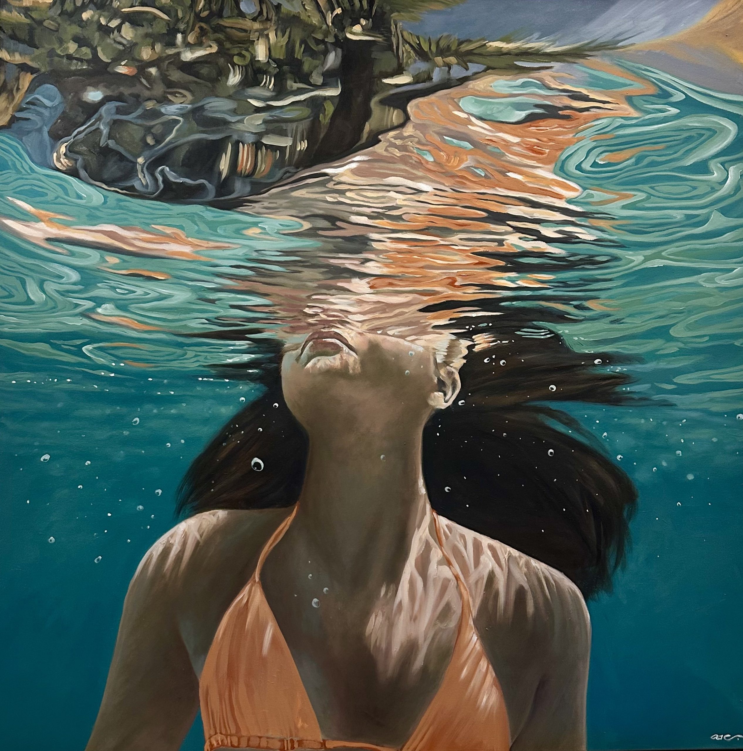 Retreat by Amanda Cameron – is one of a new series called ‘Salt Water’. While still exploring the interaction and connection between water, light and form, this series also analyses the sense of disquiet when swimming in deep ocean water. At the same time, the main focus is the quest for refuge, quietness and escapism. These paintings juxtapose the lone swimmer and a few minutes of introspection when alone in deep water against the fear of the unknown. The constant struggle between hyper-realism and having a painterly quality to my work is a conflict I always try to balance; therefore, thick paint and evident brush strokes are present when viewed up close. This piece is painted in professional oil paints on a museum-quality canvas and finished with edges painted and varnish for protection. It comes ready to hang and includes a certificate of authenticity.