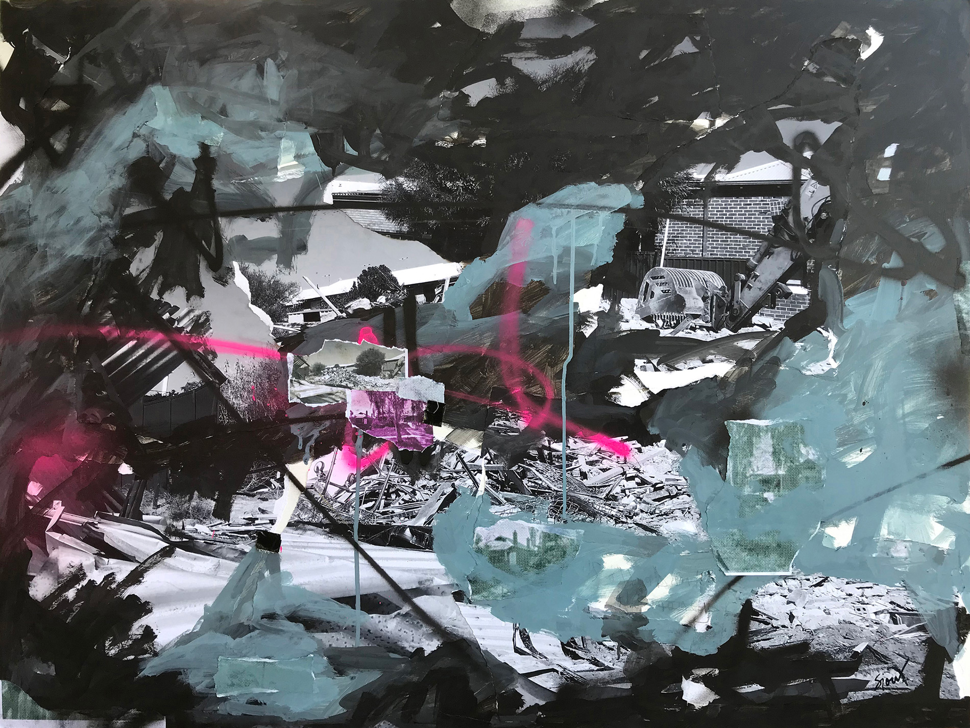 The artwork documents some of my many expeditions and interactions. Perhaps unremarkable at first glance, I find quiet beauty in the ugliness of the ordinary. A narrative of exposing the anonymous unfolds through manipulation, both physical and digital, the rhythmic repetition and overlapping of imagery gouging beyond the superficial.The brush strokes and mark making are energetic replicating the physicality I inject. This draws parallels with the physical nature of the documentation process where I jog, cycle and walk while investigating.